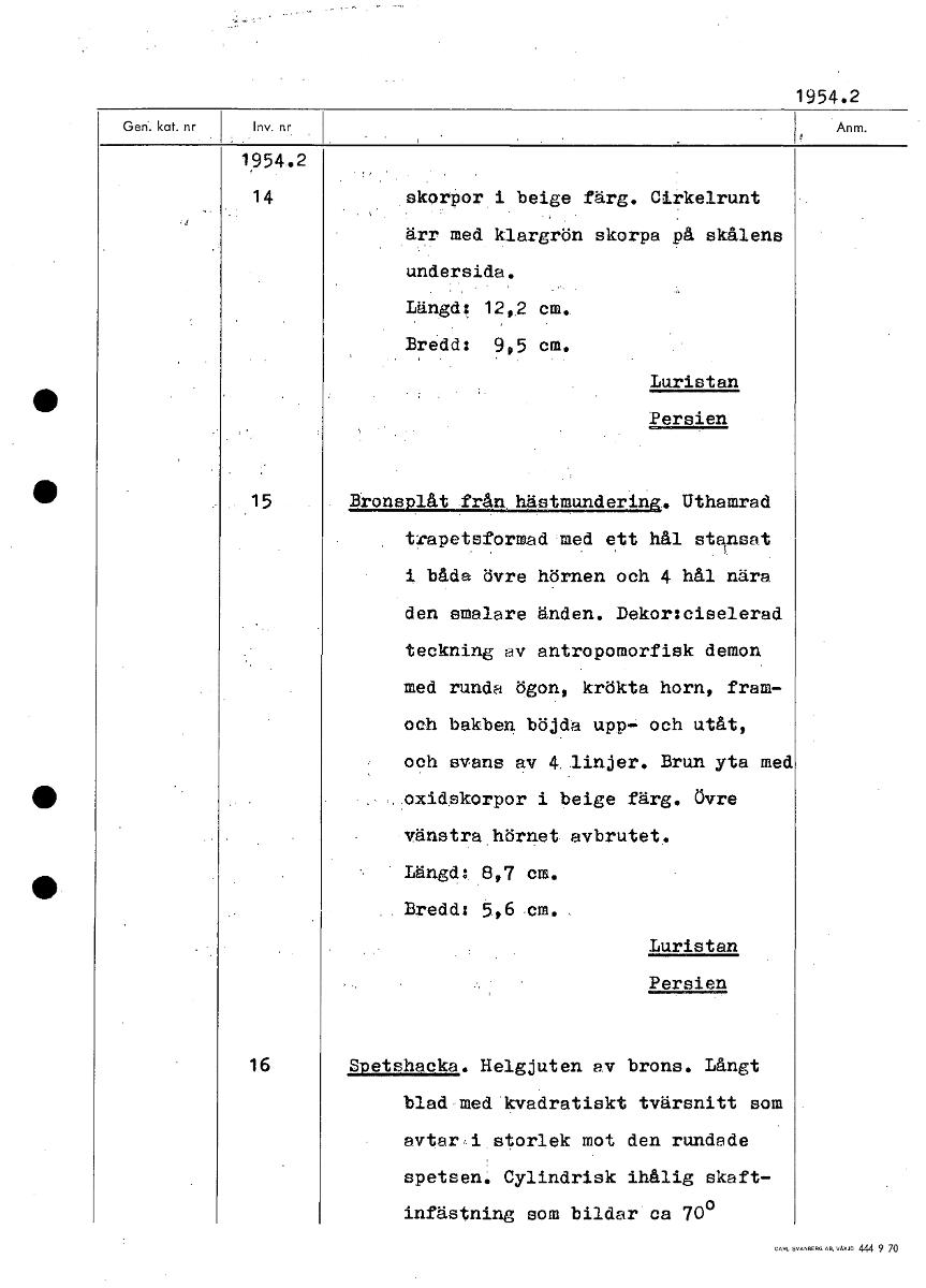 1954.2 1954.2 14 skorpor i beige färg. Cirkelrunt ärr med klargrön skorpa på skålens undersida. Längd: 12,2 cm. Bredd: 9,5 em. Luristan Persien 15 Bronsplåt från hästmundering. Uthamrad trapetsformad ...