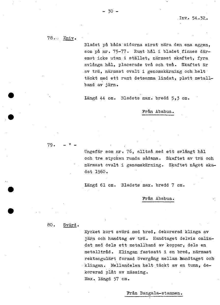 • - 30- Inv.. 54,32, 78.- Kniv. Bladet på båda'sidorna sirat nära den ena eggen, som på nr. 75-77. Runt hål i bladet finnes där- emot icke utan .i stället, närmast skaftet, fyra avlånga hål, placerade t... Visa hela