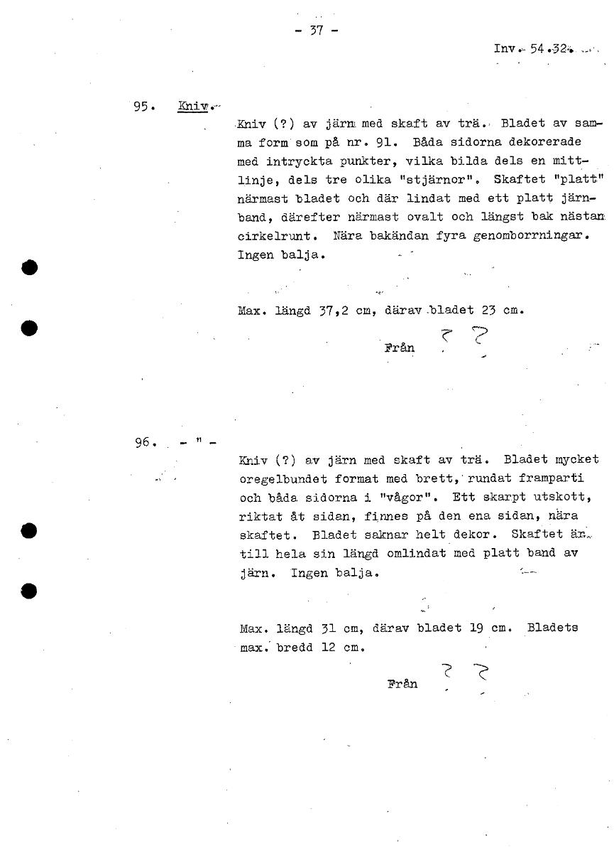 - 37 - Inv 54 .-324. 95. iv.- Kblv (?) av järn med skaft av trä. Bladet av sam- ma form som på nr. 91. Båda sidorna dekorerade med intryckta punkter, vilka bilda dels en mitt- linje, dels tre olika "s...