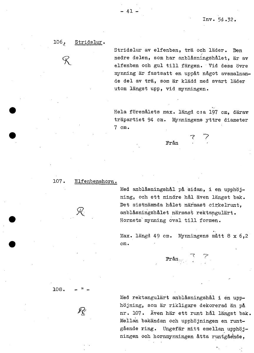 - 41 - Inv . .54 .32. 106. Stridslur. Stridslur av elfenben, trä och läder. Den nedre delen, som har anblåsningshålet, är av elfenben och gul till färgen. Vid dess övre mynning är fastsatt en uppåt nå...