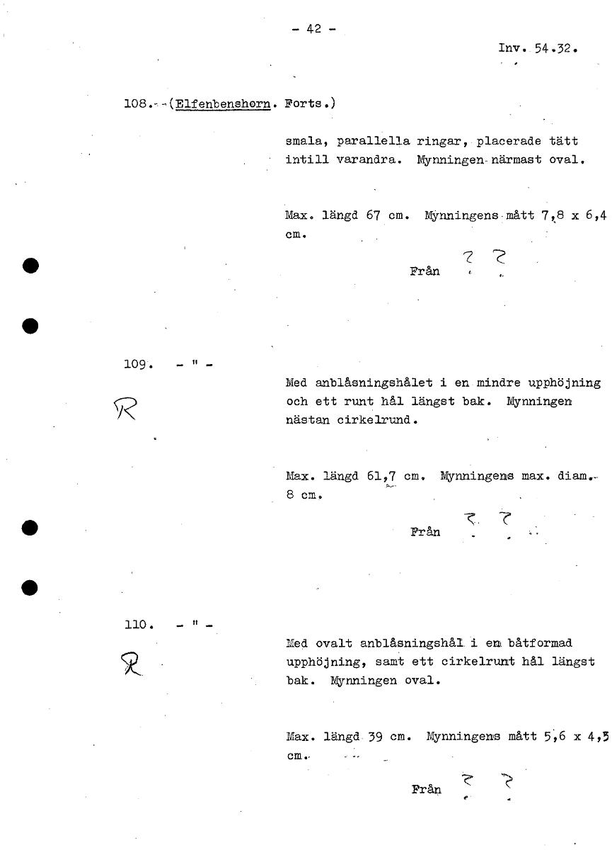 -42- Inv. 54.32. 108.—(Elfenbenshorn. Forts.) smala, parallella ringar, placerade tätt • intill varandra. Mynningen-närmast oval. Max. längd 67 cm. Mynningens mått 7,8 x 6,4 cm. • Från • 109. Med anbl...