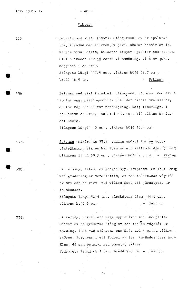 Inv. 1915. 1. - 48 - Vikter. 335. - Betsman med vikt (stor). stång rund, av brunpolerat trä, i ändan med en krok.av järn. Skalan består av in- slagna metallstift, bildande linjer, punkter och tecken. Skalan endast för en sorts vikttäkning. Vikt av järn, hängande i en krok. Stångens längd.197.5 cm., viktens höjd 18.7 cm., bredd 16.5 cm. - Peking. • 336. Betsman med vikt (mindre). Stångkund, rödbrun, med.skala av-inslagna määsingsstift. Obs! det finnes två skalor, en för köp och en för försäljning. Rätt finurligt. I ena ändan en krok, fästad.i ett rep. Vid vikten är fäst ett snöre. Stångens.längd-110 cm., viktens höjd 10.4 cm. 337. Betsman (mindre än 336). Skalan endast för en sorts vikträkning. Vikten har form av ett sittande djur (hund?) Stångens längd 69.3 cm., viktens höjd 9.3. cm. - Peking Handelsvåg, liten, av gängse typ. Komplett. En kort stårg med gradering av metallstift, en tefatsliknande vågskål av trä och en vikt, vid vilken ännu ett järnstycke är fastbundet. Stångens längd 30.5 cm., vågskålens diam. 14.'8 cm., viktens höjd 6 cm. - Peking. 339. Silvervåg, d.v.s. att väga upp silver med. Komplett. Består av en graderad stång av ben med * en vågskål av mässing, fäst vid stångens ena ända med 4 grötis. silkes- snören. Förvaras i ett fodral av trä. Användes över hela Kina, då man betalar med omyntat silver. Fodralets längd 45.1 cm., bredd 7.8 cm. - Peking. [ocr]