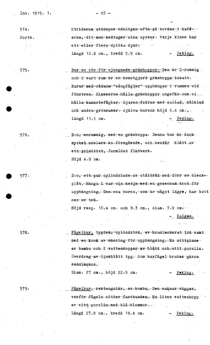 Inv. 1915. 1. - 83 - 574. .S trideena- utkämpas-4lämligen-ofta-på-bordew-1 -kafk- forts. e rnaf-dit-man7-medtager-eina-syreor. Varje -kines har e t t-eller-flera-dy14ka-d-jur-.-- - • Längd 12.6 cm., bredd 5.9 cm. — Peking. • 575. Bur av rör -för-s jungande -gr äs hepp o r n- är- 2-1- ummi g och- -i- va-r t --rum- är en- kens tå j o-r d- -gräshoppa,- -ins at t . • Burar me d--s ådana---",s ångfå-g larm upphängas' -i 'rummen -vid f öns tren,., Kineserna 4Alla,-gräshoppor . ung e f är,-, som . vi hålla, ,kanariefågl ar. D j uren -fodras med- -s allad kålb lad • och andra-i-grönsaker S j ä lva burens- -höjd 6.4 em . , längd 11.5 cm. Peking. 576 . D: of, -enrtunmig-,, med -en, gräshoppa Denna -bur - är dock mycket, enklare --än ,föregående och b e står -b lått -.av ett primitivt, formlöst flatverk. Höjd 4.9 cm. • 577. D: o -ett.- -pari. .cylindriska av, ståltråd, med, dörr av-,bleck- p låt . Hänga i, var s4nF ked ja-me d , .e n gemensam, krok för upph-ängni ng Den -ena -buren, s som är någo t lägre , har bot t nen ev trä. Höjd resp. 10.4 cm. och 9.3 cm., diam. 7.9 cm. Kal-gan. 578. Fågelbur-, - typiekk-ty ev-brunlaokerat, ,trä -sam t med -enkrole-av-liiä,sadtgy-för-upp#ängningEn- sittpinne - ?N -b-ambu--ach-2 ',vatten-koppar..-..:&V. blått -:ocivmitt..-:;:par.slin... Över-drag-,av..-,,-4191-ått -tyg.- • -8- om..-burfågel-br ukas-----gärna . sandlä;kop._ Diam. 27 cm.., höjd 22.5 cm. 579. Fågelburrektangulärf,-avAambuDew,:saknarväggar vurförfågeInaitter-fastbundenEnliten-vattenkoPP • av-vitt,-porslinvmedblåvblommor„, Längd 27.8 cm., bredd 18.4 cm. yeking., • [ocr]