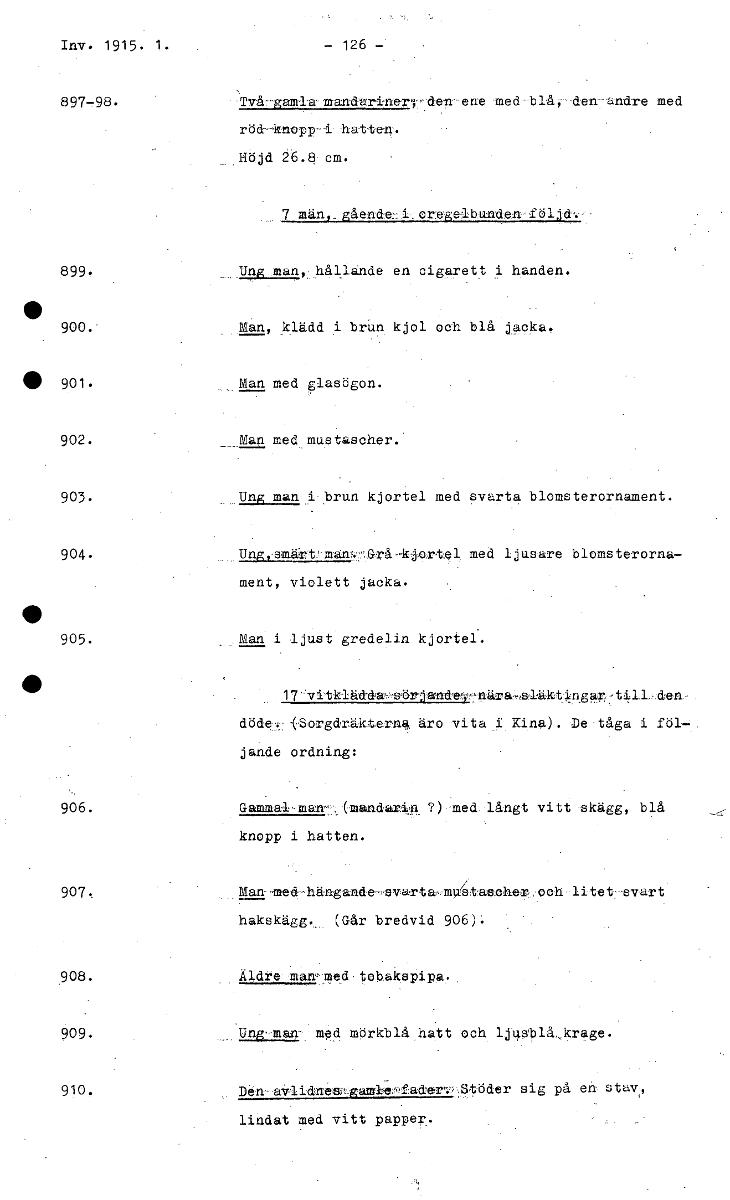Inv. 1915. 1. - 126 897-98. -Tågamla-mandarinerv-den- ene -med-blå -den- andre med röd-knp-p-i. hatten. Höjd 26.8. cm. 7 män, gående:i- oregelbunden följd-.- - 899. Ung man, hållande en cigarett i handen. • 900. Man, klädd i brån kjol och blå jacka. • 901. Man med glasögon. 902. Man med mustascher. 903. Ung man i. brun kjortel med svarta blomsterornament. 904. Ung,amämanrå--ktortel med ljusare blomsterorna- ment, violett jacka. • 905. Man i ljust gredelin kjortel. • döde. '(Sorgdräkterna äro vita i Kina). De tåga i föl- jande ordning : 906. Gammal-manmandar4n ?)-med.-långt vitt skägg, blå knopp i hatten. 907. Man 'ined-hängande-,svarta, raga tusch-er och litet -svart hakskägg. bredvid 906): 908. Äldre man,med tobakelpiPa. 909. Ung, man- med mörkblå hatt och ljåsblå,krage. 910. Den-avlidaesp,gamle-TfadervStöder sig på en stuv, lindat med vitt papper. [ocr]