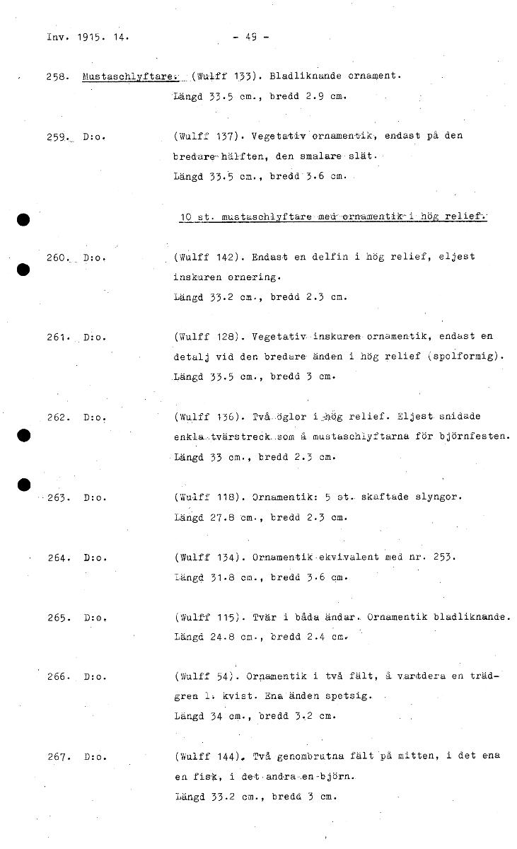 • Inv. 1915. 14. - 49 258. Mustasehlyftare. (Wulff 133). Bladliknande ornament. längd 33.5 cm., bredd 2.9 cm. 259. D:o. (Wulff 137). Vegetativ ornamenti•• endast på den bredare-hälften, -den smalare-slä... Visa hela
