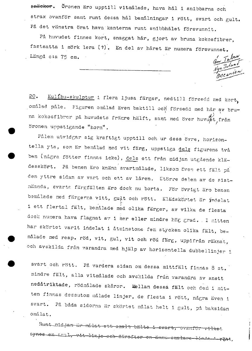 snäckor. öronen äro upptill vitmålade, hava hål i snibbarna och strax ovanför samt runt dessa hål bemålningar 1 rött, svart och gult. På det vänstra örat hava kanterna runt snibbhålet försvunnit. På huvudet finnes kort, snaggat hår, gjort av bruna kokosfibrer, fastsatta 1 mörk lera (?). En del av håret är numera försvunnet. .6c.A/ Längd c:a 75 cm. / 0- ' 20. Kulnpu-skulptur i flera ljusa färger, nedtill försedd med kort) omålad påle. Figuren omålad även baktill oc'Å försedd med hår av bru- d) na kokosfibrer på huvudets främre hälft, samt med över huvukti i från öronen uppstigande "horn". • Pålen utvidgar sig kraftigt upptill och ur dess övre, horison- tella yta, som är bemålad med vit färg, uppstiga dels figurens två • ben (några fötter finnas icke) , dels ett från midjan utgående klå- desskört. På benen äro knäna svartmålade, liksom även ett fält på den yttre sidan av vart och ett av låren. Större delen av de sist- nämnda, svarta färfälten äro dOck nu borta. För övrigt äro benen bemålade med färgerna vitt, gult och rött. Klädskörtet är indelat i ett flertal fält, bemålade med olika färger, av vilka de flesta dock numera hava flagnat av 1 mer eller mindre hög grad. . I mitten har skörtet varit indelat i åtminstone fem stycken olika fält, be- • målade med resp. röd, vit, gul, vit och röd färg, uppifrån räknat, och avskilda från varandra med hjälp av horisontella dubbellinjer I • svart och rött. På vardera sidan om dessa mittfält finnas 8 st. mindre fält, alla vitmålade och avskilda från varandra av snett nedåtriktade, rödmålade skåror. Mellan dessa fält och deå i mit- ten finnas dessutom målade linjer, de flesta i rött, några även i svart. På båda sidorna är skörtet målat helt i gult, på baksidan omålat. rk441,t—m e rbt t , [ocr]