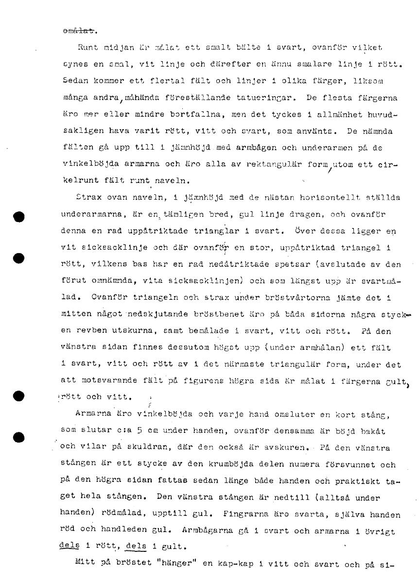 sunt midjan är målat ett smalt bälte i svart, ovanför vilket synes en smal, vit linje och därefter en ännu smalare linje i rött. Sedan kommer ett flertal fält och linjer 1 olika färger, liksom många andra/måhända föreställande tatueringar. De flesta färgerna äro mer eller mindre bortfallna, men det tyckes i allmänhet huvud- sakligen hava varit rött, vitt och svart, som använts. De nämnda fälten gå upp till i jämnhöjd.med armbågen och underarmen på de vinkelböjda armarna och äro alla av rektangulär form utom ett cir- / kelrunt fält runt naveln. Strax ovan naveln, i jämnhöjd med de nästan horisontellt ställda • underarmarna, är en tämligen bred, gul linje dragen, och ovanför denna en rad uppåtriktade trianglar i svart. Över dessa ligger en vit sicksacklinje och där ovanfe en stor, uppåtriktad triangel i • rött, vilkens bas har en rad nedåtriktade spetsar (avslutade av den förut omnämnda, vita sicksacklinjen) och som längst upP är svartmå- lad. Ovanför triangeln och strax under bröstvårtorna jämte det i mitten något nedskjutande bröstbenet äro på båda sidorna några styck en revben utskurna, samt bemålade i svart, vitt och rött. På den vänstra sidan finnes dessutom högst upp (under armhålan) ett fält i svart, vitt och rött av i det närmaste triangulär form, under det att motsvarande fält på figurens högra sida är målat i färgerna gult) • ;rött och vitt. Armarna äro vinkelböjda och varje hand omsluter en kort stång, som slutar c:a 5 cm under handen, ovanför densamma är böjd bakåt 1111 och vilar på skuldran, där den också är avskuren. På den vänstra stången är ett stycke av den krumböjda delen numera försvunnet och på den högra sidan fattas sedan länge både handen och praktiskt ta get hela stången. Den vänstra stången är nedtill (alltså under handen) rödmålad, upptill gul. Fingrarna äro svarta, själva handen röd och handleden gul. Armbågarna gå i svart och armarna i övrigt dels i rött, dels i gult. Mitt på bröstet "hänger" en kap-kap i vitt och svart och på si- [ocr]