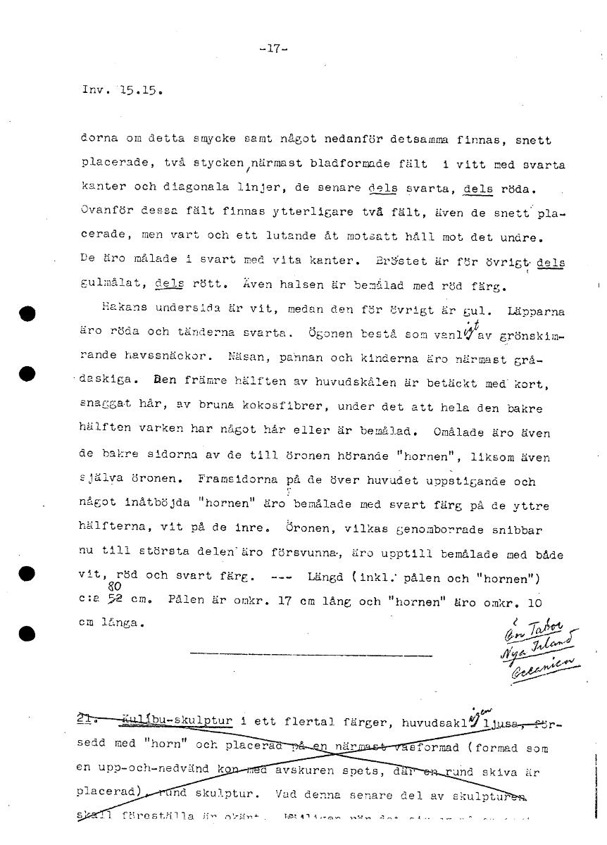 17 Inv. 15.15. dorna om detta smycke samt något nedanför detsamma finnas, snett placerade, två stycken närmast bladformade fält i vitt med svarta kanter och diagonala linjer, de senare dels svarta, dels röda. Ovanför dessa fält finnas ytterligare två fält, även de snett pla- cerade, men vart och ett lutande åt motsatt håll mot det undre. De äro målade i svart med vita kanter. Bröstet är för övrigt dels gulmålat, dels rött. Även halsen är bemålad med röd färg. • Hakans undersida är vit, medan den för övrigt är gul. Läpparna äro röda och tänderna svarta. Ögonen bestå som vanlVav grönskim- rande havssnäckor. Näsan, pahnan och kinderna äro närmast grå- • 'daskiga. nen främre hälften av huvudskålen är betäckt med kort, snagat hår, av bruna kokosfibrer, under det att hela den bakre hälften varken har något hår eller är bemålad. Omålade äro även de bakre sidorna av de till öronen hörande "hornen", liksom även själva öronen. Framsidorna på de över huvudet uppstigande och något inåtböjda "hornen" äro bemålade med svart färg på de yttre hälfterna, vit på de inre. Öronen, vilkas genomborrade snibbar nu till största delen'äro försvunna•, äro upptill bemålade med både • vit, röd och svart färg. --- Längd (inkl: pålen och "hornen") SO c:a 52 cm. Pålen är omkr. 17 cm lång och "hornen" äro omkr. 10 cm långa. e e- • d • to, L'^1.1jDLI,::22321211 1 ett flertal färger, huvudsaklAgllgsa,-41tr- sedd med "horn" och placera n när sformad (formad som en upp-och-nedvänd ko avskuren spets, dår und skiva är placerad) end skulptur. Vad denna senare del av skulptur- [ocr]