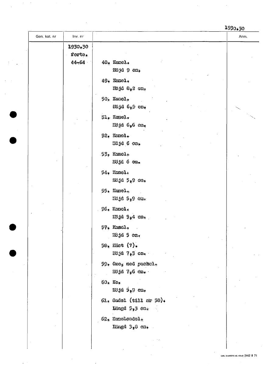 1930.30 1930030 fot. 4444 48* gamel* flöja 9 cm- 49* genel* nöja e 2 50* Kanel* Höjd 69 em,* 51 Zame, fläjd 6,6 04* 52* Kamelw ljö36 em*, 53* Kamel*, Böjd 6 em* 54.• Una* nöjd 5,9 öme 55* Kamel*, nöjd 59 em5, 56.Eaael* nöjd 50 em* 970nm014.! - Höjd 5 em* 580 Met (?)* 7,3 om* • 399 Ox% med p4eitel. 116J6 706 dmo- 609 Kai. oja 5,9 em* 61* Sadel (till nr 98), Lanad 9,3 ömå , 154 Eemeledel* 'anad 3pa [ocr]