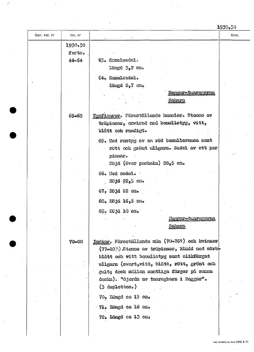 1930.30 1930.30 4464 längd 342 em. 64., Kamelsadel. Längd 247 cm._ 65-69 Träfigurer föreställande kameler. Stomme av träpinnar omvirad mod bomullstyg vitt, blått och randigt. 65, Ted tomtyg e en rOd bcnualeraa oamt rött och Grönt ullgarn., Sadel av ett -par Pinnar. nöjd (över puckeln) 2005 cm. 66. flad Oadel. U ?2,95 6 IR3A01 22 634, nöjd 16, ko.,01,Dockor föreställande män (70-76) och kvinnor (77-80). Stomme av träpinnar, klädd med mörkblått och vitt bomullstyg samt olikfärgat ullgarn (svart, vitt, blått, rött, grönt och gult, dock sällan samtliga färger på samma docka),. "Gjorda av tuaregbarn i Haggar. (3 duPlettoN.) 70. • '*ad oa /5 em. fl /Und ea 16 om. d ca 13 em. [ocr]