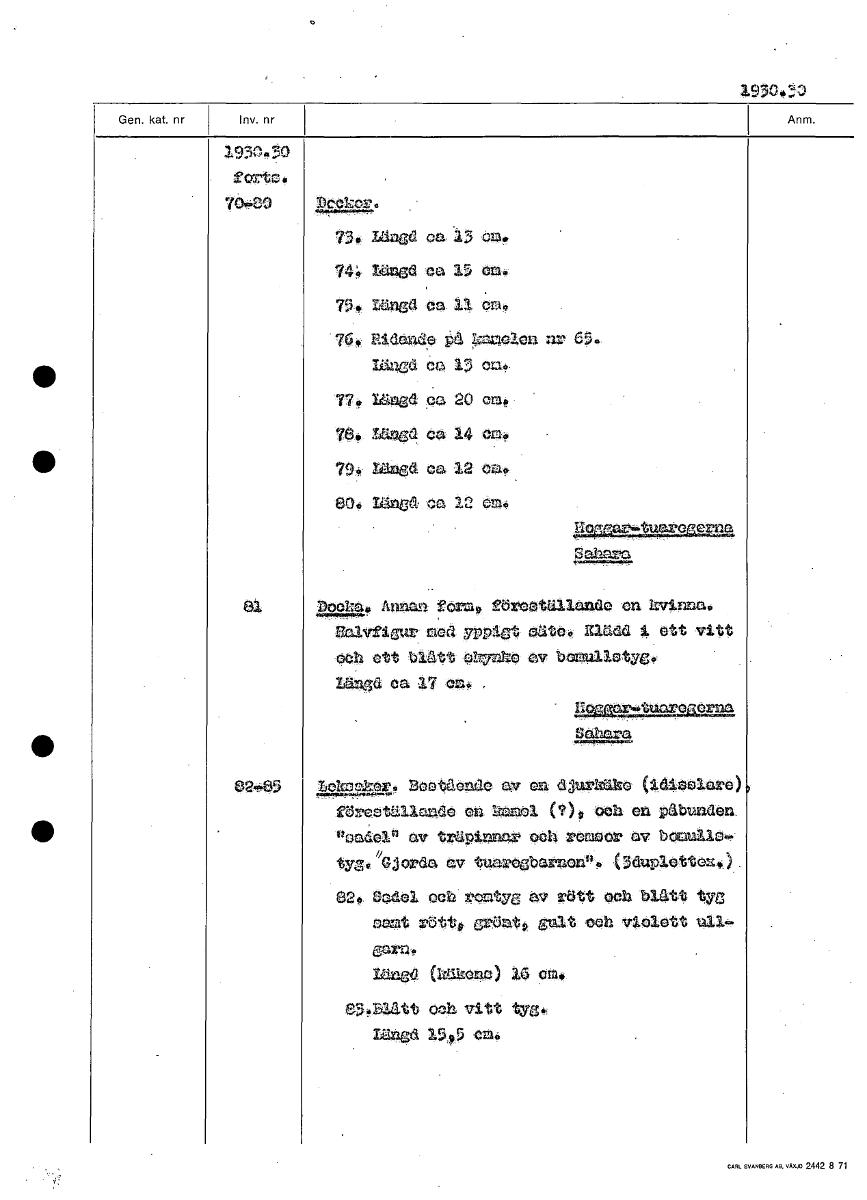 1930.30 1930.30 4464 längd 342 em. 64., Kamelsadel. Längd 247 cm._ 65-69 Träfigurer föreställande kameler. Stomme av träpinnar omvirad mod bomullstyg vitt, blått och randigt. 65, Ted tomtyg e en rOd bcnualeraa oamt rött och Grönt ullgarn., Sadel av ett -par Pinnar. nöjd (över puckeln) 2005 cm. 66. flad Oadel. U ?2,95 6 IR3A01 22 634, nöjd 16, ko.,01,Dockor föreställande män (70-76) och kvinnor (77-80). Stomme av träpinnar, klädd med mörkblått och vitt bomullstyg samt olikfärgat ullgarn (svart, vitt, blått, rött, grönt och gult, dock sällan samtliga färger på samma docka),. "Gjorda av tuaregbarn i Haggar. (3 duPlettoN.) 70. • '*ad oa /5 em. fl /Und ea 16 om. d ca 13 em. [ocr]
