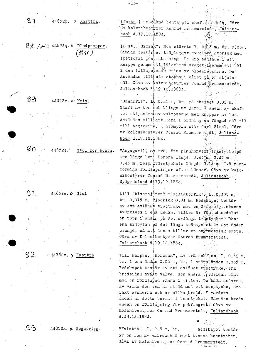 -13- Ö7 44852n. Kastträ. ' (florts.) urhölkad bontappji skaftet'a:ända, Gåva av kolonibestyrer Konrad Brummerstedt,- . Juliane- haab , d.19.12:T884. 44852q. 4 Blodproppar. 12 st.."Simiak": Den största...