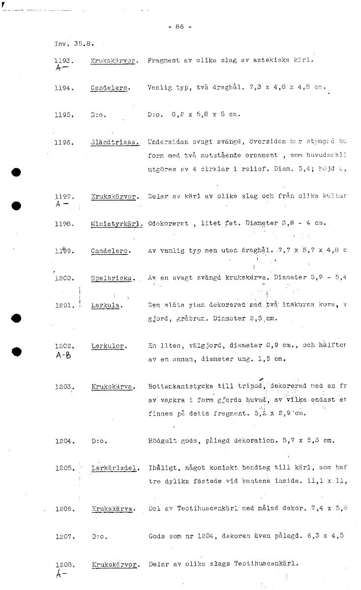 - 86 - Inv. 35.8, 1193. KrukskSrvor. Fragment av olika slag av aztekiska 1,2r1. Ar 1194, Candelero. Vanlig typ, tv ä draghål. 7,3 x 4,8 x 4,6 cm. 1195. D:o. D:o. 8,2 x 5,6 x 5 cm. 1196. Sländtrissa. U...