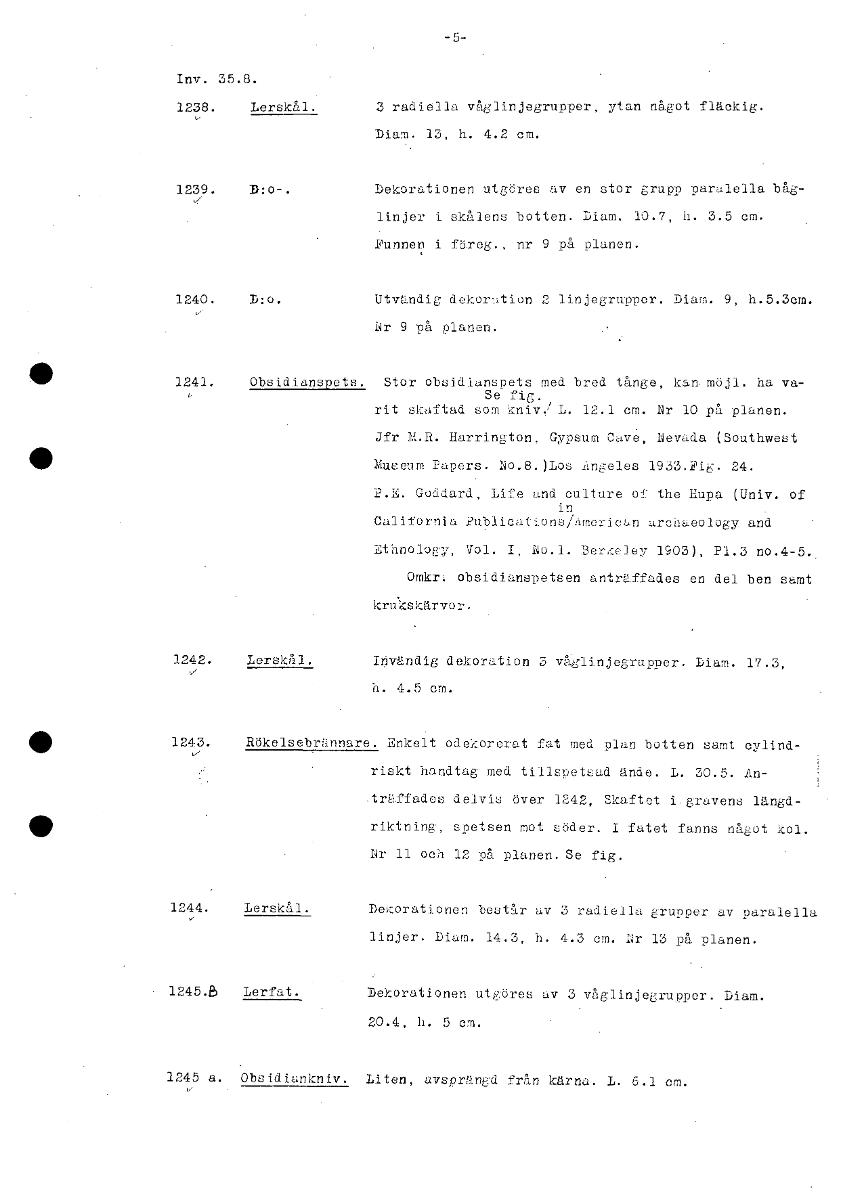 Inv. 35.8. 1238. Lerskål. 3 radiella våglinjegrupper, ytan något fläckig. Diam. 13, h. 4.2 cm. 1239. D:o-. Dekorationen utgöres av en stor grupp paralella båg- linjer i skålens botten. Diam. 10.7, h. 3.5 cm. Funnen i föreg., nr 9 på planen. 1240. D:o. Utvåndig dekoration 2 linjegrupper. Diam. 9, h.5.3cm. Nr 9 på planen. 1241. Obsidianspets. Stor obeidianspets med bred tånge, kan- möjl. ha va- , Se fig. rit skaftad som kniv/ L. 12.1 cm. Nr 10 på planen. Jfr M.R. Harrington, Gypsum Cave, Nevada (Southwest • Museum Papers. No.8. )Los Angeles 1933.Fig. 24. P.L. Goddard, Life und culture at the Eupa (Univ. of in California Publications/American archaeology and Ethnology, Vol. I, Bo.l. Berkeley 1903), P1.3 no.4-5. Omkr obsidianspeteen anträffades en del ben samt krukskärvor. 1242. Lerskål. Invändig dekoration 3 våglinjegrupper. Diam. 17.3, h. 4.5 cm. • 1243. Rökelsebrpnnare. Enkelt odekorerat fat med plan botten samt cylind- riskt handtag med tillspetsad ände. L. 30.5. An- .träffades delvis över 1242, Skaftet i.gravens längd- 110 riktning, spetsen mot söder. I fatet fanns något kol. Nr 11 och 12 på planen. Se fig. 1244. Lerskål. Dekorationen består av 3 radiella grupper av paralella linjer. Diam. 14.3, h. 4.3 cm. Nr 13 på planen. 1245.8 Lerfat. Dekorationen utgöres av 3 våglinjegrupper. Diam. 20.4, h. 5 cm. 1245 a. Obsidiankniv. Liten, avsprängd från kärna. L. 6.1 cm. [ocr]