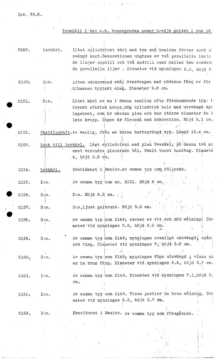 2149. Lerkärl. Litet cylindriskt kärl med tre små koniska fötter samt u- svängd kant.Dekorationen utgöres av två parallella de linjer upptill och två nedtill samt mellan dem snedst da parallella lijer . Diameter vid mynningen 6.2, höjd 5 2150: D:o. • Liten °dekorerad skål överdragen med rödbrun färg av för .tihuacan typiskt •slag. Diameter 9.8 cm. 2151. D:o. Litet kärl av en i denna samling ofta förekommande typ: Y W tryckt sfärisk kropp,hög cylindrisk hals med utsvängd myi ingskant, som är nästan plan och har större diameter än k lets kropp. Iingen är: försedd med dekoratlon. Höjd 6.1 cm. • 2152. Obsidiankniv.Av vanlig, från en kärna bortsprängd, typ Längd 10.4 cm. 1 I 2153. Lock till lerkärl. Lågt åylindripkt med plan överdel; spå denna två ml I , emot varandra placerade hål. Smalt tunnt handtag. Diamete höjd 2.3 åm. I i 4, i 2154. Lerkärl. Kvarlämnat iexico.Av samma,tyP soebljande. 2155. D:o. Av samma typ som no. 2151. Höjd 6 en. i; • 2156. D:o. D:o. Höjd 6.3 cm. 1 1 2157. D:o. D:o,ljust gulbrunt. Höjd 5.6 cm. 2158. D:o. Av samma typ som 2149; rester av 'vit bh nöd målning Dia meter'vid mynningen :6.2, höjd: 'cm. 2159. D:o. Av samma typ som 2149; mynningen ovanligt utsvängd; spår; röd färg. Diameter vid mynningen 71höjd 2160.. D:o. Av samma typ som 2149; mynningen föga u svängd ; vissa P(4 er ha brun färg. Diameter vid mynningen 6.6, höjd 5.7 cm. 2161. D:o. Av samma. typ som 2149. Diameter vid mynningen 7.1,höjd 5. 2162. D:o. Av samma typ som 2149. Vissa portier ha brun målnirtg. Die meter vid mynningen 6.3, höjd 5.7 cm. 2163. D:o. Kvarlämnat i Mexico. Av samma typ som föregående. [ocr]