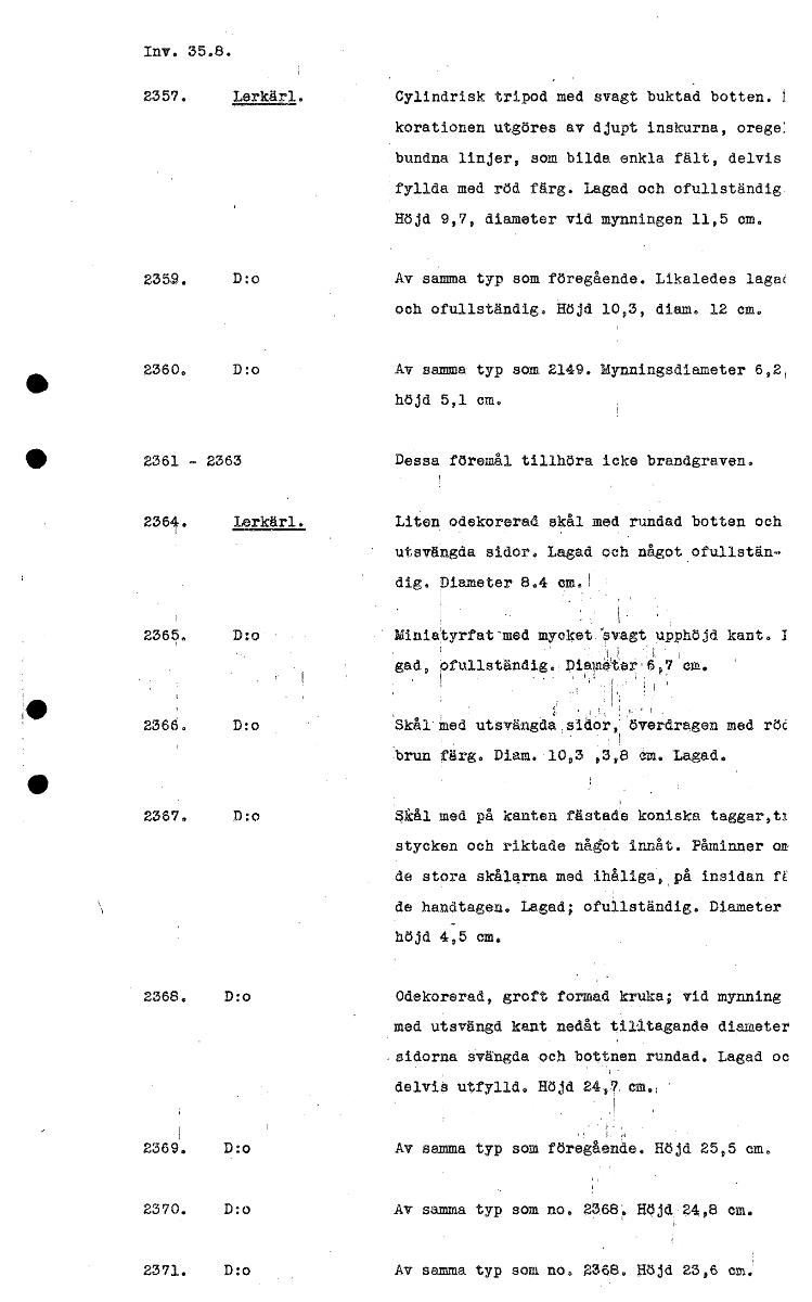 • Inv. 35.8. 2357. Lerkärl. Cylindrisk tripod med svagt buktad botten. i korationen utgöres av djupt inskurna, orege: bundna linjer, som bilda enkla fält, delvis fyllda med röd färg. Lagad och ofullstän... Visa hela