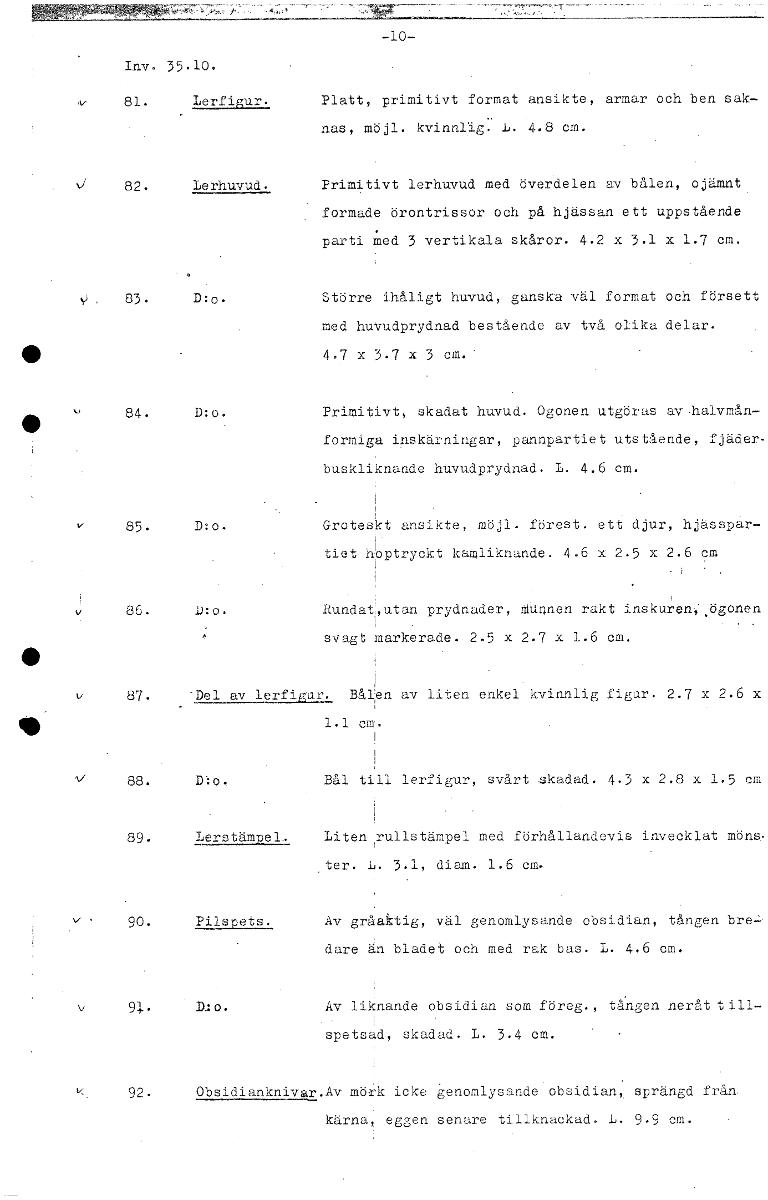 -10-- Inv. 35.10. 81. Lerfigur Platt, primitivt format ansikte, armar och ben sak- nas, möjl. kvinnlig. Z. 4.8 cm. 82. Lerhuvud. Primitivt lerhuvud med överdelen. av bålen, ojämnt formade örontrissor ...
