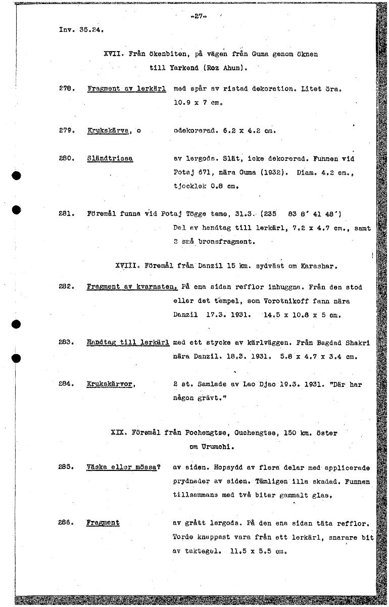 «27- Inv. 35.24. XVII. Från ökenbiten, på vägen frän Guma genom öknen till Yarkend (Roz Ahun). 278, Erasment av lerkärl med spår av ristad dekoration. Litet öra. 10.9 x 7 em. 279, Krukskärva, o °dekor...
