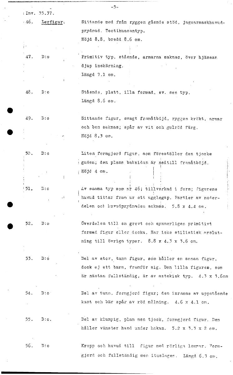 -5- Inv. 35.37. 46.IlrrUur. Sittande med från ryggen gående stöd, jaguarmaskhuvud- prydnad. Tectihuacantyp. Höjd 8.8, bredd 8.6 om. 47. D:o Primitiv typ, stående, armarna saknas, över hjässan djup ins...