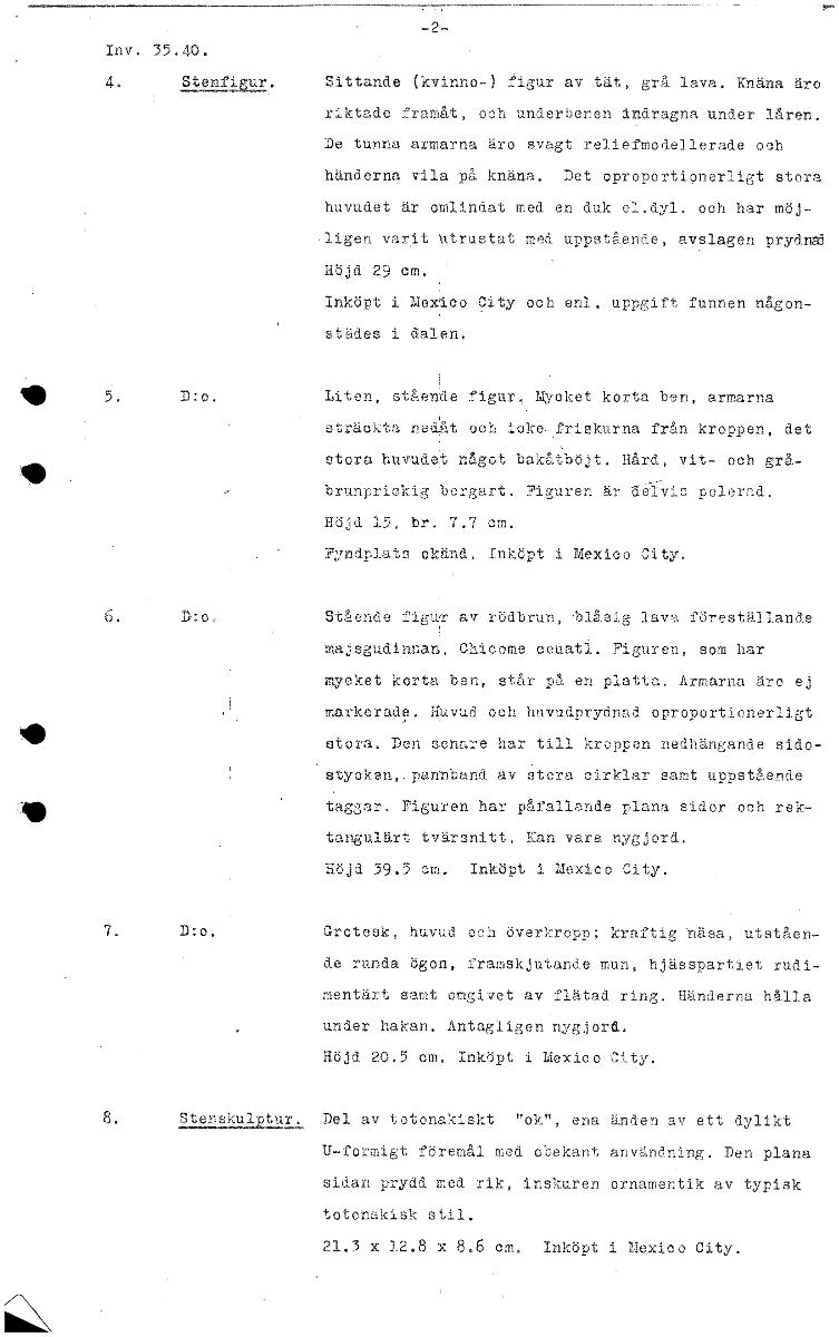 -2- Inv. 35.40. 4. Sterfi ri.zr . Sittande (kvinno.-) figur av tät, grå lava. Knäna äro riktade framåt, och underbenen indragna under låren. De tunna armarna äro svagt reliefmodellerade och 'händerna ...