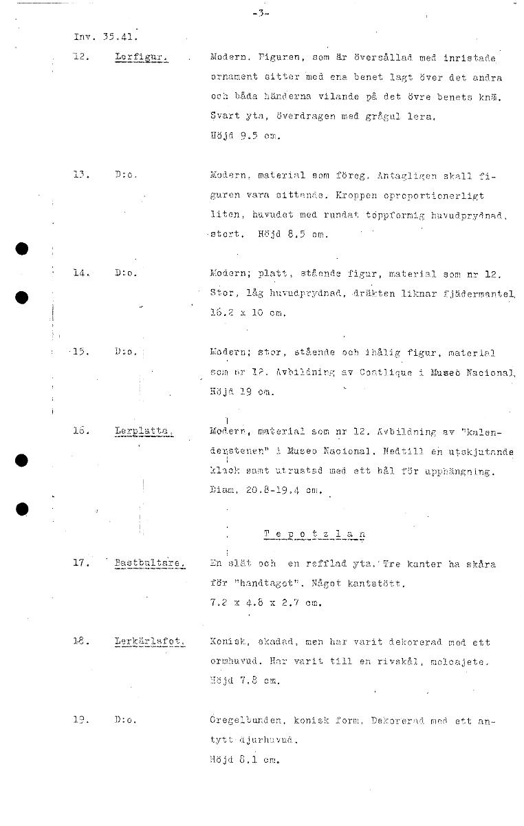 Inv. 35.41. 12. erfiur, Modern. Figuren, som är översållad med inristade, ornament sitter med ena benet lagt över det andra och båda händerna vilande på det övre benets knä. Svart yta, överdragen med grågul lera, nid 9.5 cm, 13. D:o, Modern, material som föreg., Antagligen skall fi- guren vara sittande. Kroppen oproportionerligt liten, huvudet med rundat tdpoformig huvudprydnad, .stort. Höjd 8.5 cm. Diodein, platt, stående figur, material som nr 12. Stor, låg huvudprydnad, ,dräkten liknar fjädermantel, 16.7 x 10 cm. 15. , Modern; stor, stående och ihålig figur, materian som nr 12. Avbildning av ,oatlique i Muset) Nacional, Höjd 19 cm. 1 . 16. LerplrAtta. Modern, material som nr 12. Avbildning av "kalen- derstenen" 1 Mae co Nacional. Nedtill eh utskjutande klack samt utrustad ett hål för upphängning. Diam, 20.8-19.4 cm, Te z l•an Bastbultare. En slät och en refflad yta, Tre kanter ha skåra för "handtaget". Något kantstött. 7.2 x 1.8 x 2.7 om. Lerkärisfot. Konisk, skada__ mer har varit dekorerad med ett ormhuvud. Har varit till en rivskål, molcajete. Höjd 7.8 cm. lq. D:o. Oregelbunden, konisk form. Dekorerad med ett an- tytt.djurhuvud, Höjd 8.1 cm. [ocr]