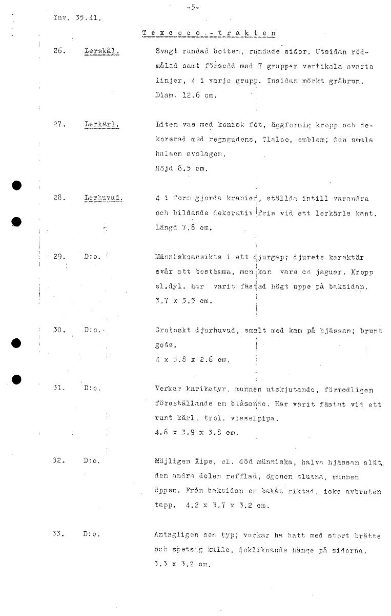 Inv 35.4.1 a k en 6. Lerskål. Svagt rundad botten, rundade sidor. Utsidan röd- målad samt försedd med 7 'grupper vertikala svarta linjer, 4. i varje grupp. Insidan, mörkt gråbrun. Diam. 12.6 cm. 27. Lerkär . Liten vas med konisk fÖt, äggformig kropp och de- korerna med regngudens, Tlnloc, emblem; den Smala halsen avslagen. Höjd 6.5 cm. • 28. Lerhuvud. 4 i form gjorda kranier, ställda intill varandra och bildande dekorativifris vid, ett lerkärls knnt. Längd. 7.8 om, 29. D:o, Människoansikte i ett djurgap; djurets karaktär svår att bestämma, men pkan vara en jaguar, Kropp el,dyl. har varit -fäsad högt uppe på baksidan. 3.7 x 3.5 cm, 30. D:o.- Groteskt djurhuvud, smalt med kam på hjässan; brunt • gods. 4 x 3.8 x 2.6 cm. 110 D:o. Verkar karikatyr, munnen utskjutande, förmodligen föreställande en blåsande. Har varit fästat vid, ett runt kärl, trol. visselpipa. 4.6 x 3.9 x 3.8 cm. 32, D:o, Möjligen Xipe, el. död människa, halva hjässan slät, den andra delen refflaa, ögonen slutna, munnen. öppen. Från baksidan en bakåt riktad , icke avbruten tapP. 4.9 x 3.7 x 3.2 cm. 33. D:o. Antagligen sen typ; verkar ha hatt med stort brätte och spetsig kulle, dokliknande hänge på sidorna. 3.3 x 3.2 em. [ocr]