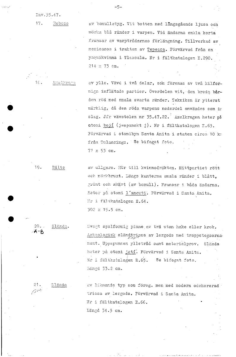 Inv.35.47. Ktv bomullstyg. Vit botten med lg.ngsgående ljusa och mörka blå ränder i varpen. Vid ändarna enkla korta. fransar av varptrådarnas förlängning. Tillverkad av mexicanos i trakten av Tepeaca. Förvärvad från en. yaouikvinna i Tlaxcala. Nr i fältkatalogen E.290. 214 x 73 cm. av ylle. Vävd i två delar, som förenas av två kilfot- miga inflätade partier. Överdelen vit, den breda bår- den röd med smala svarta ränder. Tekniken är ytterst • märklig, då den röda varpens nederdel användes som ir slag. Jfr vävstolen nr 35.47.22. Axelkragen heter på otomi bog (j =spanskt j). Nr i fältkatalogen E.63. Förvärvad i otomibyn Santa Anita i staten circa 10 kr från Tulancingo. Se bifogat foto. 72 x 53 cm. 19. Bälte av ullgarn. Hör till kvinnodräkten. Mittpartiet rött och mörkbrunt. Längs kanterna smala ränder i blått, grönt och skärt (av bomull). Fransar i båda ändarna. Heter på otomi l'ancuti: Förvärvad i Santa Anita. • Nr i fältkatalogen E.64. 502 x 15.5 cm. 20. 22.111423.- öva spolformig pinne av trä utan hake eller krok. Ä-B Alhco_Logisk sländtrissa av lergods med trappstegsorna• ment. Uppspunnen ylletråd samt materialprov. Slända heter 1)(5. otomi jett. Förvärvad i Santa Anita. Jr i fältkatalogen E.65. Se bifogat foto. Langd 33.2 cm. 2 . Slända av liknande typ som föreg. men med modern odekorerad trissa av lergods. Förvärvad i Santa Anita. Ur i fältkatalogen E.66. Längd 34.5 cm. [ocr]Stäng