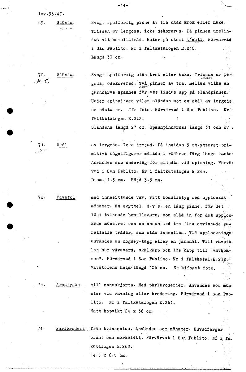 -14- Inv.35.47. 69. Slända. Svagt spolformig pinne av trä utan krok eller hake. • Trissan av lergods, icke dekorerad. På pinnen upplin- da& vit bomullstråd. Heter på o.tomi t'ehti. Förvärvad i San Pab...