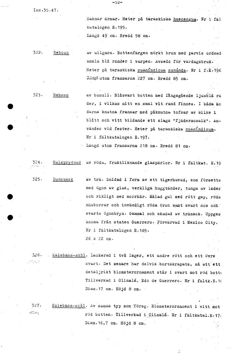 Inv.35.47. Saknar ärmar. Heter på taraskiska huenengult. Nr i.fäl katalogen E•195. Längd 49 cm. Bredd 58 cm. 322. Rebozo av ullgarn. Bottenfärgen mörkt brun med parvis ordnad smala blå ränder i varpen. Avsedd för vardagsbruk. Heter på taraskiska cuanindicua zuntinda. Nr i f.E.196 Idj.red. utom fransarna 227 cm. Bredd 85 cm. 323. Rebozo av bomull. Blåsvart botten med långsgående ljusblå rä der, i vilkas mitt en smal irit rand finnes. I båda än • darna knutna fransar med påknutna tofsar av silke i blitt och vitt bildande ett slags "fjädermosaik". An- 00 vändes vid fester. Heter på taraskiska cUanindicus. Nr i fältkatalogen E.197. Längd utom fransarna 218 cm..Bredd 81 cm. 324. Halsprydnad av röda, fruktliknande glaspärlor. Nr i fältkat. 325. Dansmask av trä. Snidad isform av ett tigerhuvud, som försetts med ögon av glas, verkliga huggtänder, tunga av läder och rikligt med morrhår. Målad gul med rött gap, röda näsborrar och invändigt röda öron samt svart nos och' svarta ögonbryn. Gammal, och skadad av trämask. Uppges komma från staten Guerrero. Förvärvad i Mexico City. Nr i fältkatalogen E.185. 26 x 22 cm. 3,26. Kalebass-skål. Lackerad i två lager, ett undre rött och ett övre. svart. Det senare har delvis bortskrapats, så att ett detaljrikt blomsterornament står i svart mot röd botts Tillverkad i Olinalå, Edo de Guerrero. Nr i fältk.E.1( Diam.17 cm. Höjd 8 cm. 327. Kalebass-skål. Av samma typ som föreg. Blomsterornament i vitt mot röd botten. Tillverkad i Olinalå. Nr i fältkatal.E.17, Diam.16,7 cm. Höjd 8 cm. [ocr]