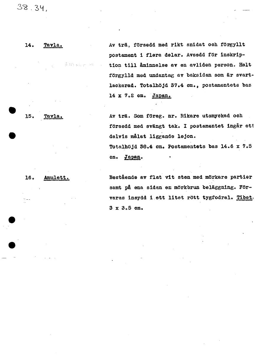32 34, 14. Tavla. Av trä, försedd med rikt snidat och förgyllt postament i flera delar. Avsedd för inskrip- tion till åminnelse av en avliden person. Helt förgylld med undantag av baksidan som är svart- lackerad. Totalhöjd 37.4 om., postamentets bas 14 x 7.2 cm. Japan. 15. Tavla. Av trä. Som föreg. nr. Rikare utsmyckad och försedd med svängt tak. 1 postamentet ingår ett delvis målat liggande lejon. Totalhöjd 38.4 cm. Postamentets bas 14.6 x 7.5 cm. Tapan. • 16. Amulett. Bestående av flat vit sten med mörkare partier samt på ena sidan en mörkbrun beläggning. För- varas insydd i ett litet rött tygfodral. Tibet, 3 x 3.5 om. [ocr]Stäng