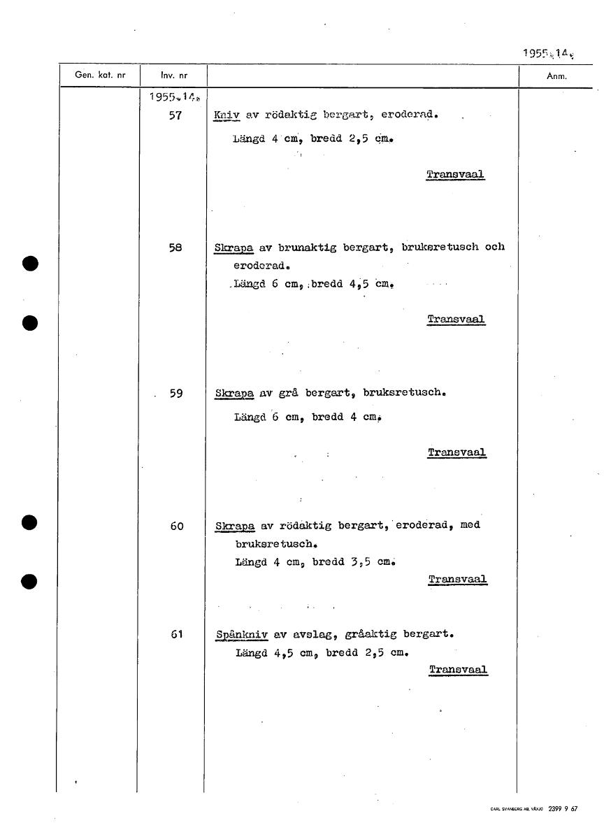 1955:,:1 1955,14 57 Kniv av rödaktig bergart, eroderad. Längd 4 cm9 bredd 295 omm Transvaal 58 Skrapa av brunaktig bergart, brukeretusch och eroderad. .Längd 6 cm9;bredd 495 6144 Transvaal . 59 Skrala...