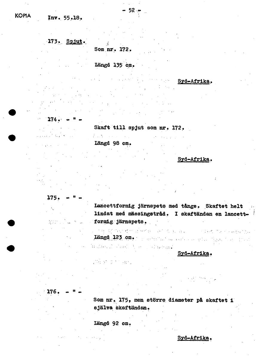 • KOPIA Inv. 55.18. 173. SIdut., Som nr. 172. Längd 135 em. Syd-Afrika. 174. Skaft till spjut som nr 172. Längd 98 cm. Syd-Afrika. 175. ft Lanoettformig jä:rnspete med tånge. .Skaftet helt lindat med mä... Visa hela
