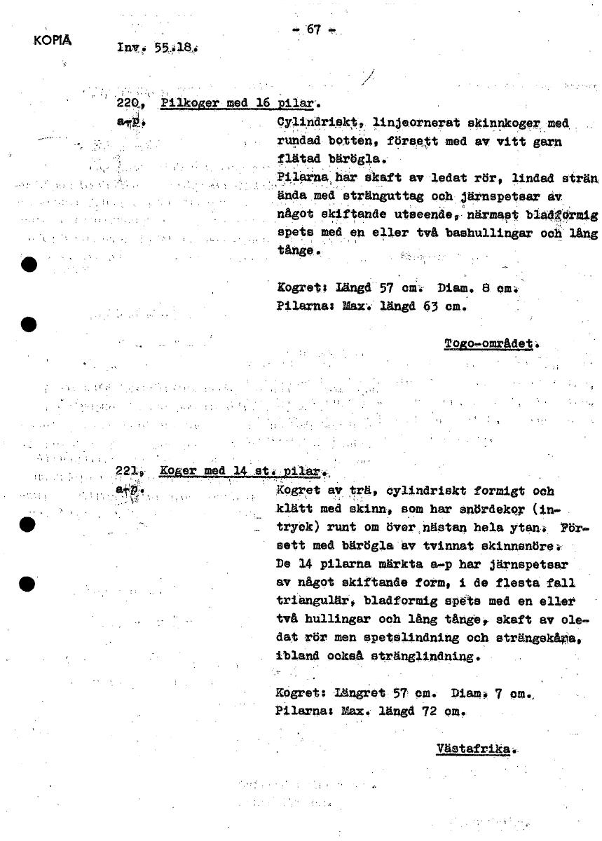 KOPIA 2204 Pilkoger med 16 pilar. gylindriekto linjeornerat skinnkoger med rundad botten, försett med av vitt garn flätad bärög44 PI,larna har Skaft av ledat rör, lindad sträv, ända med stränguttag ooh järnspett:ar av något skiftande utseendevnärmast bladtermig spets med en eller två bashullingar och lång tånge. Kogret: Längd 57 am .- Diam. 8 em.' Pilarna: Max. längd 63 cm. Togo-områdst. 222? Koteer m®d 14 styr il r atb:. Kogret av trä, cylindriskt formigt och klätt med skinn, som har snördekOr (in. tryck) runt om över,nästan hela ytan. För. sett med bärögla ev tvinnat skinnsnöre.‹ De 14 pilarna märkta a-p har järnspetsar • av något skiftande form, i de flesta fall triangulär, bladformig spets med en eller två hullingar och lång tånge, skaft av ()le- dat rör men spetslindning och strängskka, ibland också stränglindning. Kogret: Iängret 57 cm. Diam. 7 cm., Pilarna: Max. längd 72 om. VästafriXa. [ocr]