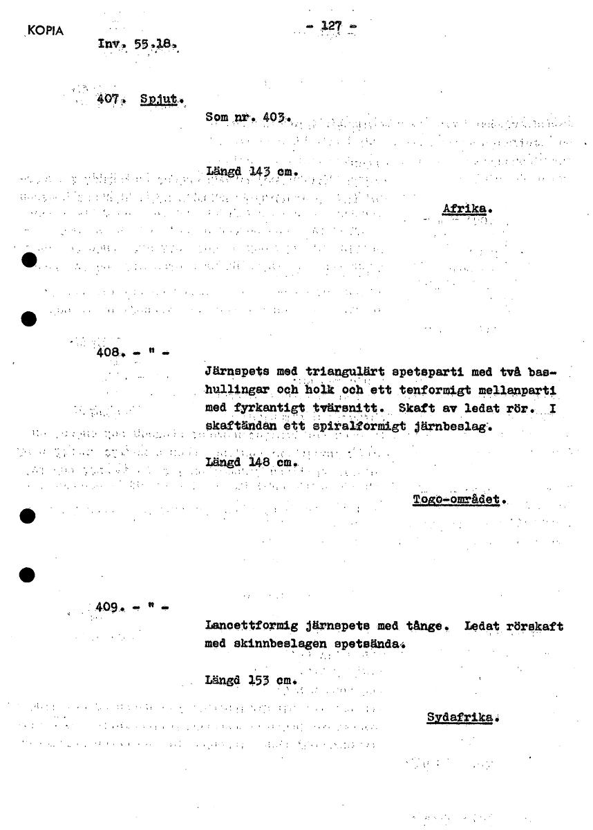 407. Spjut., Som nr. 403. Längd 143 cm Afrika.