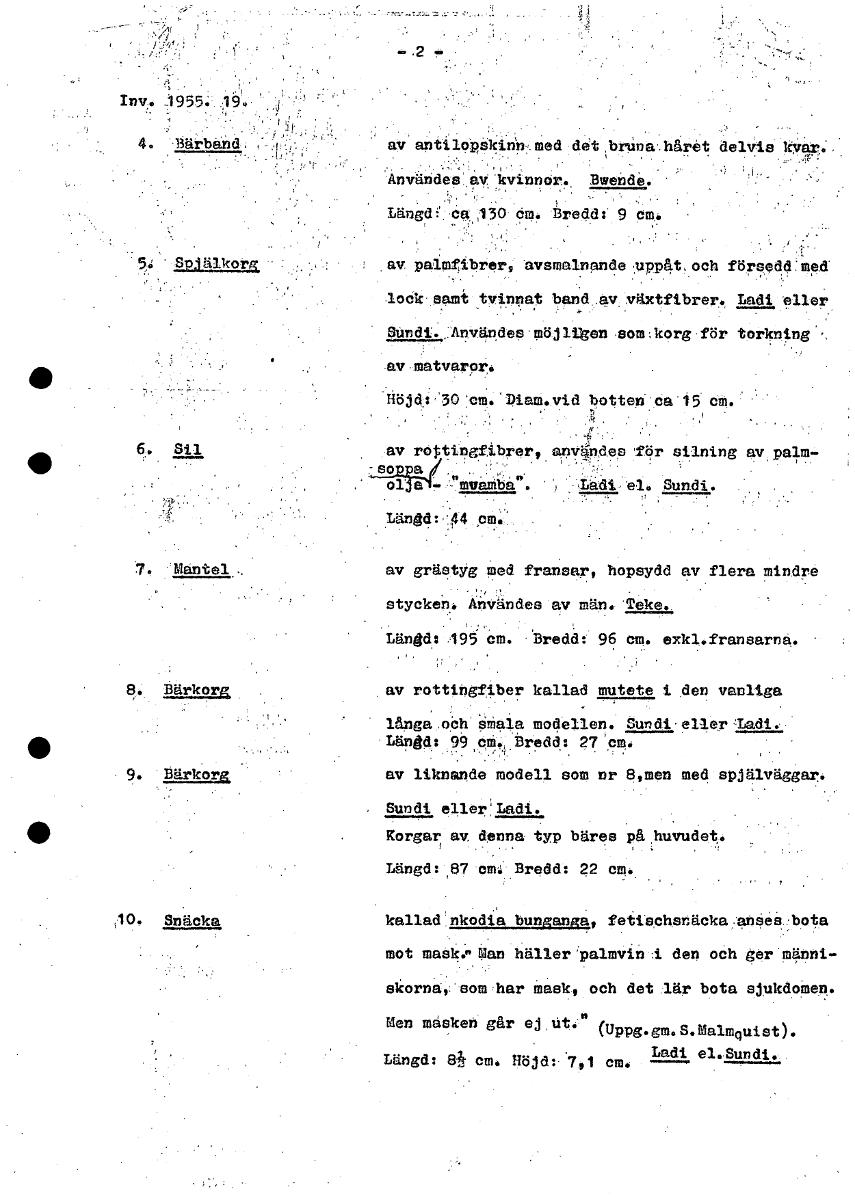4. 13ätbänd, av antilopskinn med det,brUnaAlåret delvis kVar..., Användes av kvinnör. Bwende. Länge, e0 130 dm. Bredds' 9 pm. njälkorK av paimfibrer, avsmalnande uppåt. och försedd med loCk.samt tvinnat bandev,växtfibrer. Ladi eller SUndi.:Användes möjligen ~korg för torkning snriassiAm44 Böjdt..30cm. Diam. vid botten ca 15 cm. 6.. Sil av rottingfibrer anvåndes för silning av palm- -so ••a a muamban. Ladi el. Sundi. Längd: ,44 cm. /. »Mantel, av grästyg med fransar, hopsydd av flera mindre stycken.. AUVändes av män. 'Teg Ländd:.195 cm. Bredd: 96 cm. exkl.fransarna. 8. Bärkorg. ,av rottingfiber kallad mutete i den vanliga långaoCh'SMsia modellen. Sundi.ellerLadi.. Längd: 99 eåbreddt R7'cm. B%rkorR av liknande modell som nr 8,men med spjälväggar. Sundi ellerLadi. Korgar av denna typ bäres på ,huvudet. Längd:',87 cm Bredd: 22 cm.. 10. Snäckor, kallacinkodia bunganga, fetitchstäcka,anaes:bota mot mask.' fann häller'palmvinA den och ger gpni- skormt,:Som,har Mask, och det:lär bota sjukdomen. Men masken går ej, ut. (Uppg.gm.S.Malmquist). Längd: 84 cm. Böjd: '7, 1 cm. Ladi ---- [ocr]