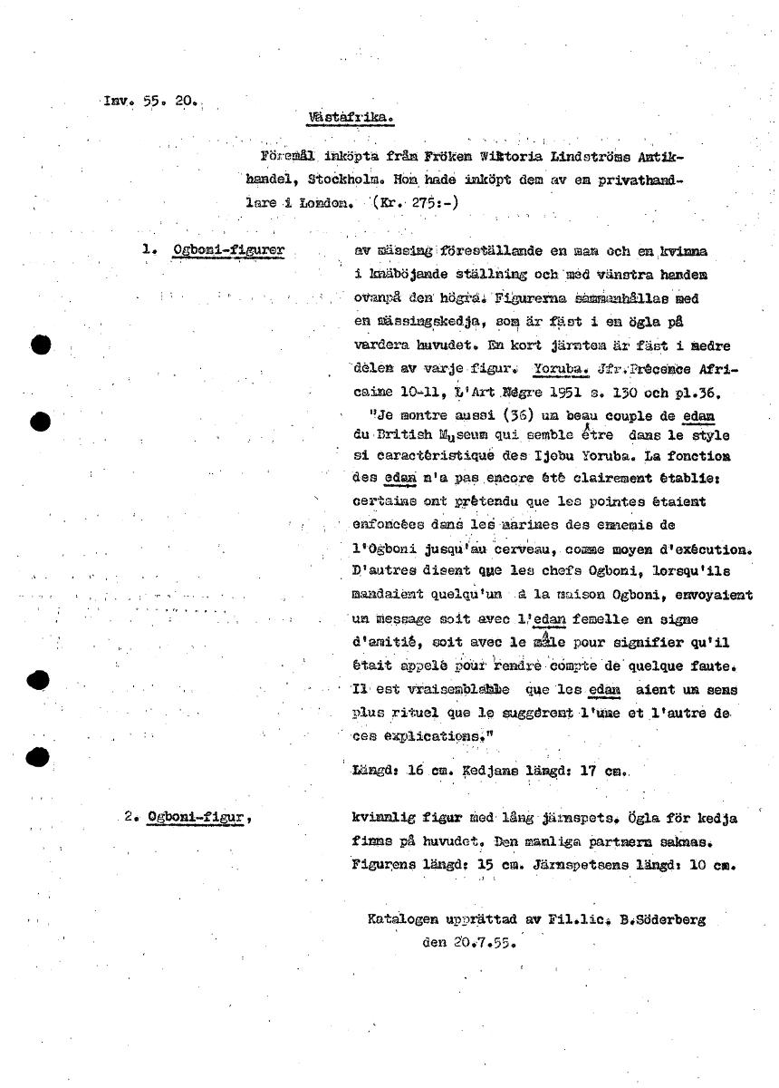 V. 55. 20. Västafrika. Pö•emål inköpta från Pröken Wittoria Lindströms Antik- handel, StoCkholm. Hon, hade inköpt dem av en privathand- lare .i London. '(Kr.' 275:-) 2.223AgmEtr. av mäesing'föreställa...