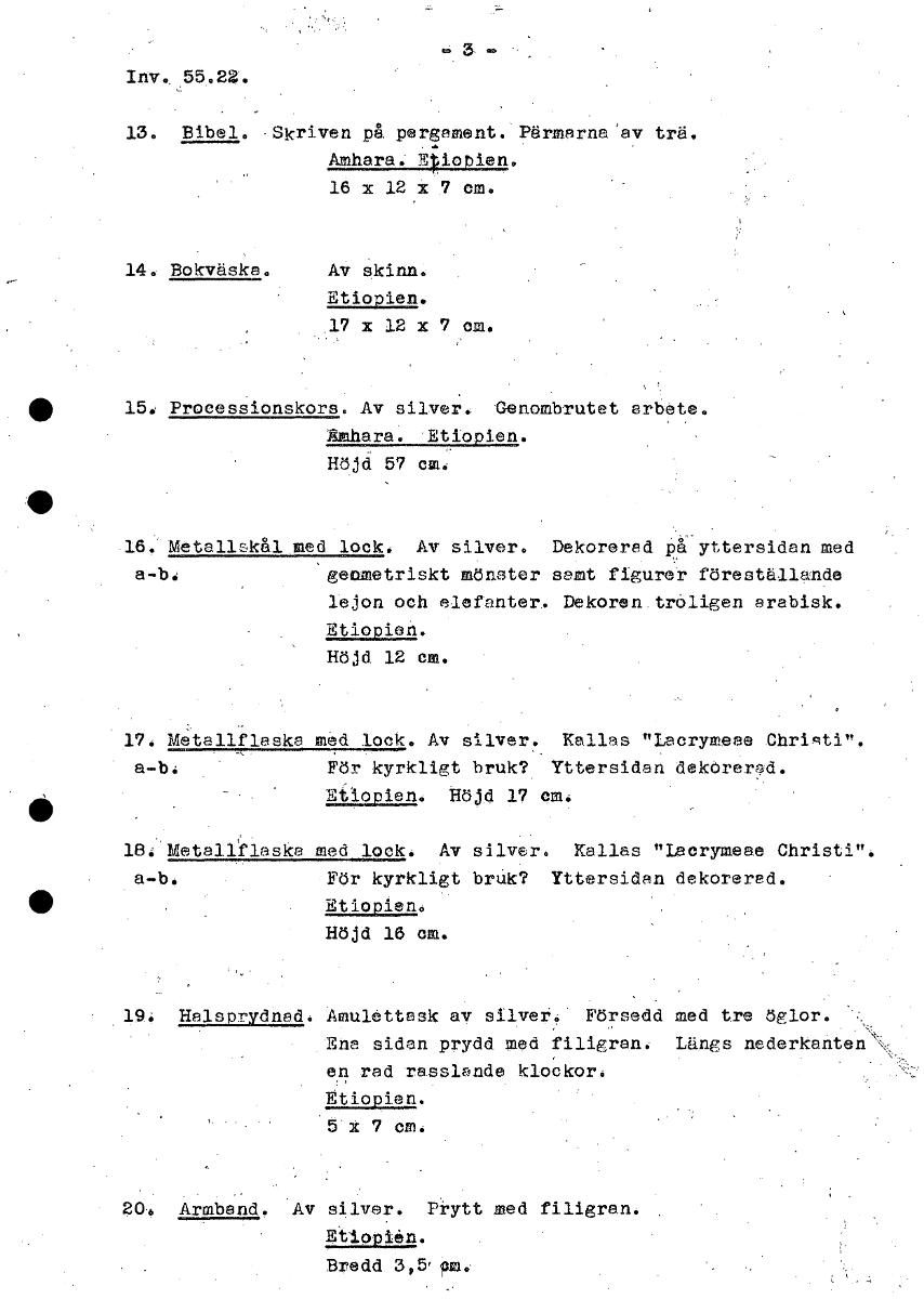 Inv. 55.22. 13. Bibel. Skriven på pergament. Pärmarna av trä. Amhara. Tiobien. 16 x 12 x 7 cm. 140 Bokväska. Av skinn. Etiopien. 17 x 12 x 7 cm. 15. Processionskors. Av silver. Genombrutet arbete. Amhara. Etiopien. Höjd 57 cm. Metallskål med lock. Av silver. Dekorerad på yttersidan med a-b: geometriskt mönster samt figurer föreställande lejon och elefanter. Dekoren,troligen arabisk. Etiopien. Höjd 12 cm. Metallflaska med lock. Av silver. Kallas "Lecrymeew. OhriRti". a-b, i'ör kyrkligt bruk? Yttersidan deköreråd. Etiopien. Höjd 17 PM: 18. Metellklaske med lock. Av silver. Kallas "Lacrymeae Christi". a-b, För kyrkligt bruk? Yttersidan dekorerad. Etiopien. Höjd 16 cm. 19, Halsprydned. Amulettask av silver, Försedd med tre öglor. Ene sidan prydd med filigran. Längs nederkånten en rad rasslande klockor. Etiopien. 5 x 7 cm. 206 Armband. Av silver. Prytt med filigran. Etiopien. Bredd 3,51m. [ocr]Stäng