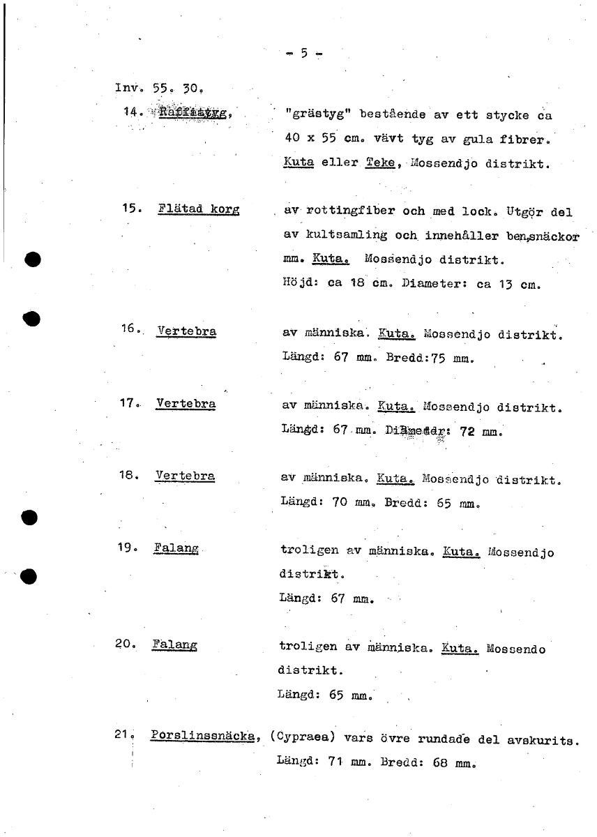 InV. 55. 30. 14.:TgAÅÅÄgg, "grästyg" bestående av ett stycke ca 40 x 55 cm. vävt tyg av gula fibrer. Kuta eller Teke, Mossendjo distrikt. 15. Flätad korg , av rottingfiber och med lock. Utgör del av kultsamling och innehåller bensnäckor • mm. Kuta. Mosåendjo distrikt. Höjd: ca 18 öm. Diameter: ca 13 cm. 16.. Vertebra av människa. Kuta. Mossendjo distrikt. Längd: 67 mm. Bredd:75 mm. Vertebra av människa. Kuta. Mossendjo distrikt. Längd: 67.mm. Diäteddr: 72 mm. 18. Vertebra av människa. Kuta. Moseendjo distrikt. Längd: 70 mm, Bredd: 65 mm. 19. Falang - troligen av människa. Kuta. Mossendjo distrikt. Längd: 67 mm. 20. Palang troligen av Människa. Kuta. Mossondo distrikt. Längd: 65 mm. 21, Porslinssnäcka, (Cypraea) vars övre rundade del avskurits. Längd: 71 mm. Bredd: 68 mm. [ocr]