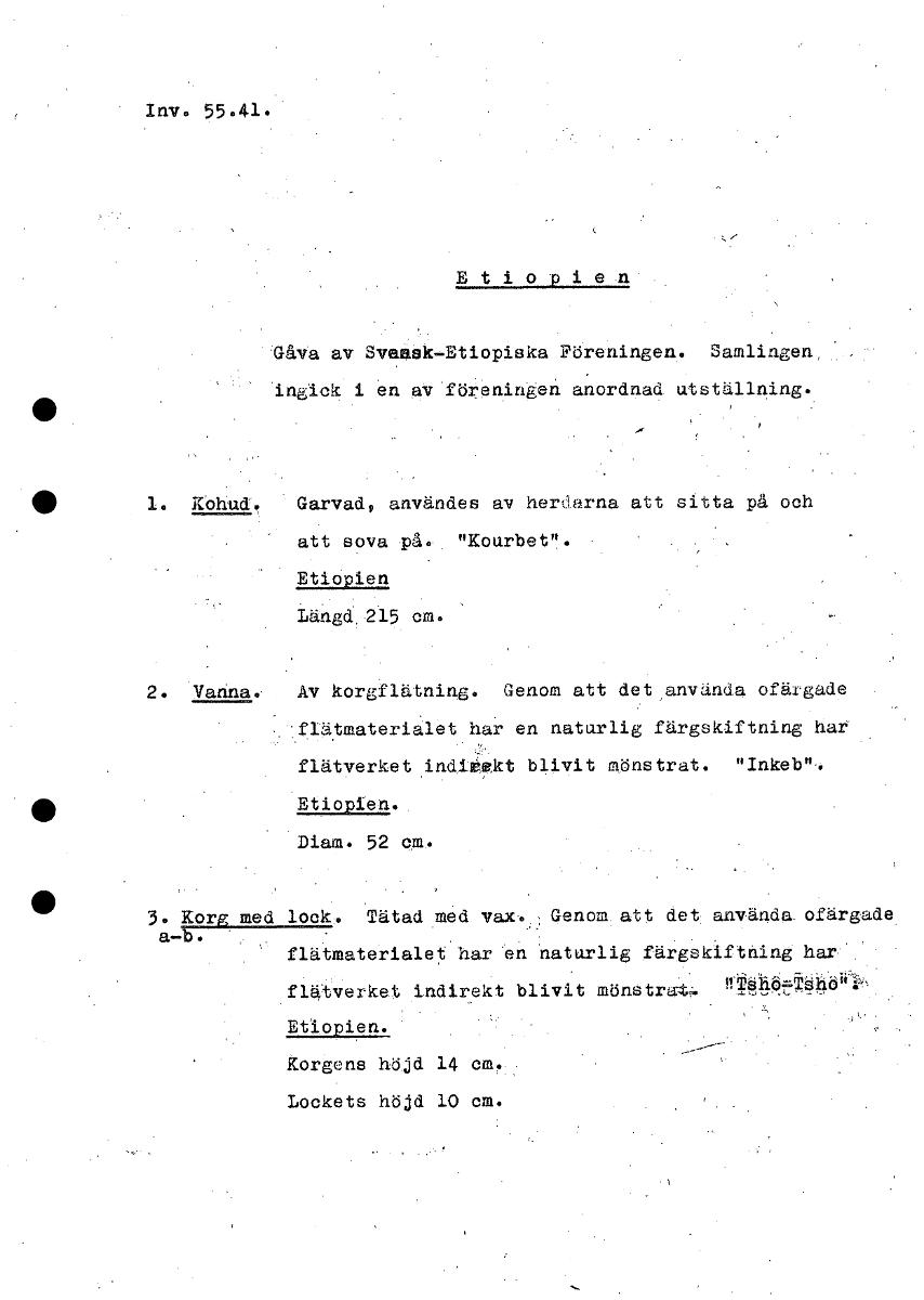 Inv. 55.41. E t i o p i e Gåva av Svaask-Etiopiska Föreningen. Samlingen ingick i en av föreningen anordnad utställning. 1. Köhud. Garvads användes av herdarna att sitta på och att sova på. "Kourbet". Etiopien Längd 215 cm. 2. Vanna. Av korgflätning. Genom att det använda ofärgade flätmaterialet har en naturlig färgskiftning hat flätverket Andi~t blivit mönstrat. "Inkeb". Etiopien. Diam. 52 pm, • 3. Korg med lock. Tätad med vax. Genom. att det använda. ofärgade a-b. flätmaterialet har en naturlig färgskiftning har flätverket indirekt blivit mönstrat- "h4öltT40ä17- Etiopien. Korgens höjd 14 cm. Lockets höjd 10 cm. [ocr]Stäng
