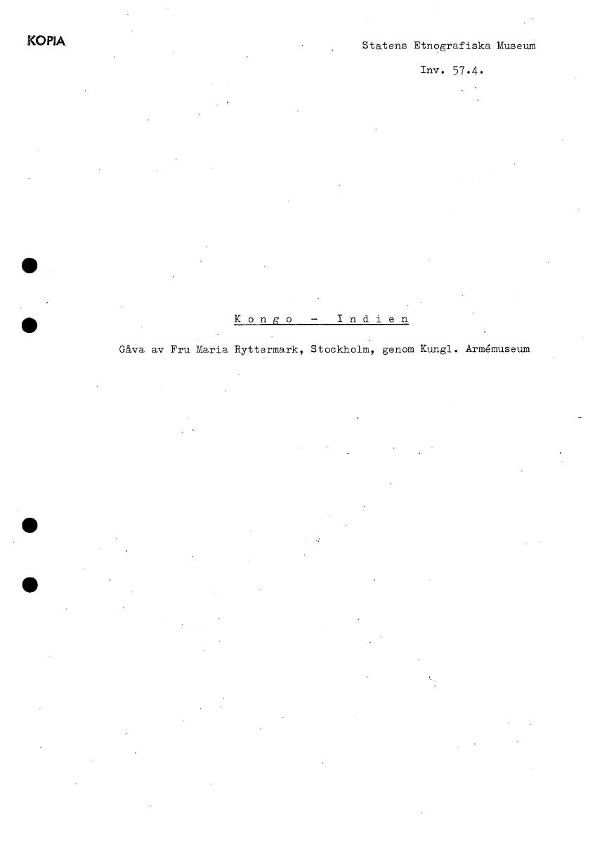 • KOPIA Statens Etnografiska Museum Inv. 57.4. Kongo Indien Gåva av Fru Maria Ryttermark, Stockholm, genom Kungl. Armsmuseum • [ocr]