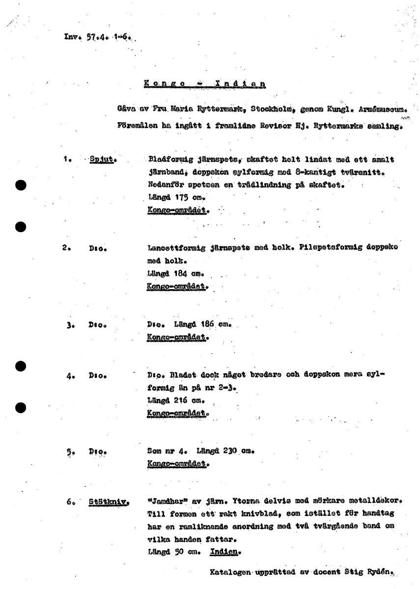 InV. va -. pirig terE ma genom Kungl* Aredmumnrae Förmalen dne Revisor Ej. Rytte rke samling. 1.• B1adformigjärnapett4 skaftet helt lindat mad, ett smalt järnband; deppakön gylformig med 8-kantigt tvärsnitt* Nadanfär spetsön en trädlindning på skaftet. Längd 175 om* 12262t2EXAdAh • Die. Lanoettformig j peta med holk. Pilepetaformig doppsko med holk. längd 184 åmezaddOlk hanea 184 Orno linWerjeddak 4. Dio. »IP. Pladat dock något bredare °oh doppakon mera syl-. formig On på nr 203.. ängd 216 cm, SzeameariaLto Som nr 4. Längd 230 ~kW gjamok n'amdhar, av järn. Ytorna delvis mad märkare metalldekor. Till formen ett' rakt knivblad, gom 'manet för handtag har en ~liknande anordning med två tvärgående band om vilka handen fattar. Längd 30 om* adla* Katalogen,Upprättad av docent Stig Ryddn.„ [ocr]Stäng
