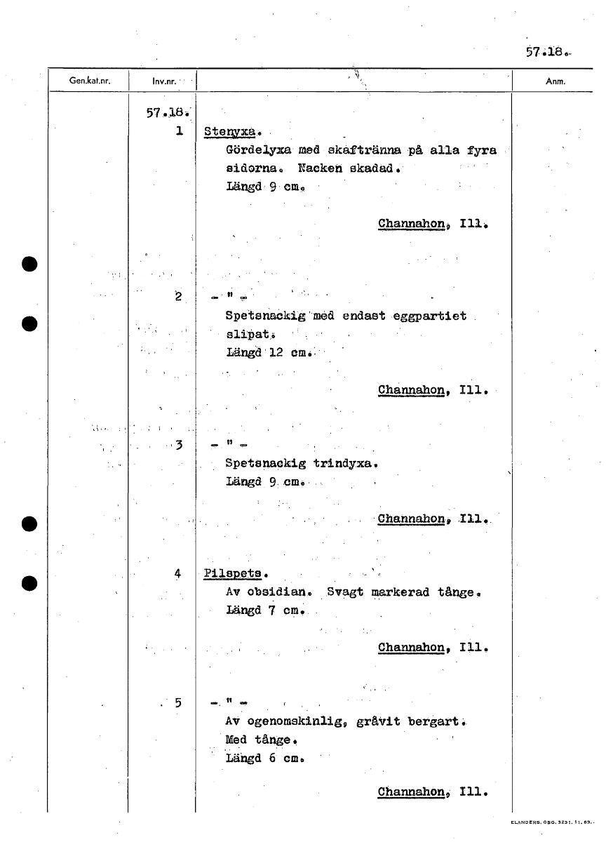 57.18 StqAU9.4 Gördelyxa med skaftränna på alla fyra sidorna. Nacken skadad. Längd 9' cm. Channahon, Ill. Spetsnackig'med endast eggpartiet , slipat. Längd 12 cm.: Channahon, Ill. 3 Spetsnackig trindyxa. Längd 9. cm. Channahon, 4 Pilspets. Av obsidian. Svagt markerad tånge. Längd 7 cm. Channahon, Ill. 5 Av ogenomskinlig, gråvit bergart.. Med tånge. 'längd 6 cm. Channahon, Ill. [ocr]