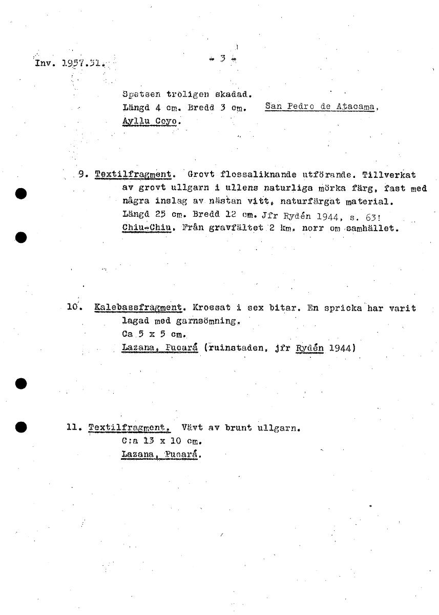 opeteen troligen skadad. längd 4 cm. Bredd 3 cm. Sån Pedro de Atacama, Anlu COY0. Textilfragment grovt flossaliknande utförande. Tillverkat av grovt ullgarn i ullens naturliga Mörka färg, fast med några inslag av nästan vitt, naturfärgat material. Längd 25 cm. Bredd 12 em. Jfr Ryden 1944, s. 63! Ch111,4111u. Från graVfältet:2 km. norr om -samhället. 10. Kalebassfraqmprt. Krossat i sex bitar. En spricka har varit lagad med garnsömning. Ca 5 x 5 cm. Lazanat ruoard, (ruinstaden, jfr Rydén 1944) 11. Textilfragment. Vävt av brunt ullgarn. C:a 13 x 10 om. Lazana. Tunarg, [ocr]