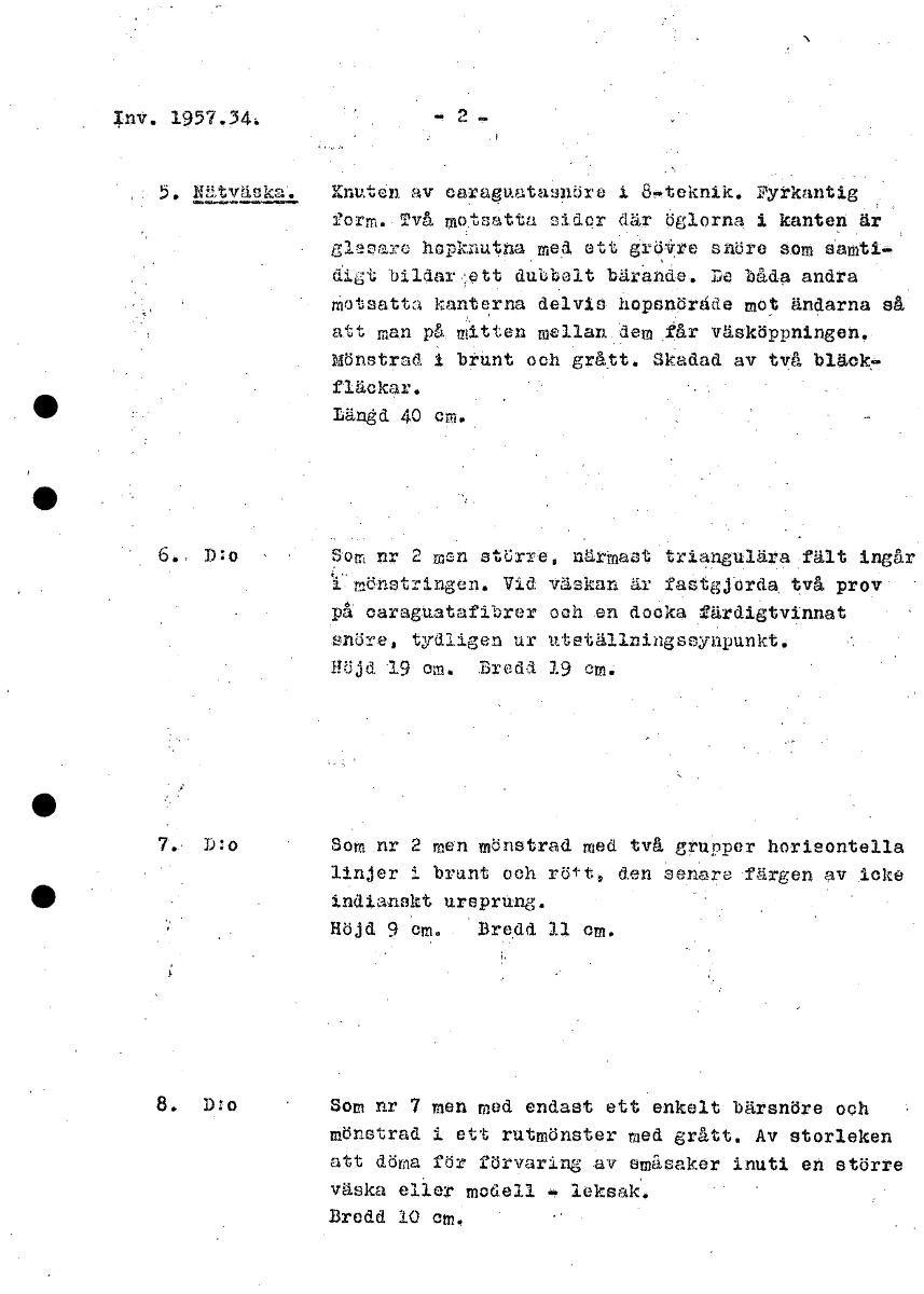 Inv. 1957.34. 5. NätvtiPk'› Knuten av caraguutaunöre i 8teknik. Pytkantig form. Tv motsatta sidor där öglorna i kanten är glesare hopknutna med ett gröVre snöre sam samti. åigt bildar tt dubbelt bärande. De båda andra Motsatta kanterna delvis hopsnörde mot ändarna så att man på mitten mellan dem kår väsköppningen. Mönstrad i brunt och grått. Skadad av två bläck. fläckar. • Längd 40 em. • 6. D:o - Som nr 2 men större, närmast triangulära fält ingår nstringen. vid väskan är fastgjorda två prov på oaraguatafibrer och en docka färdigtvinnat snöre, tydligen ur utetällningssynpunkt. Höjd 19 cm. Bredd 19 cm. • 7. D:o Som nr 2 men mönstrad med två grupper horisontella linjer i brunt och rött, den senare färgen av icke • indianskt ursprung. Röjd 9 em. Bredd 11 cm. 8. D:o Som nr 7 men med endast ett enkelt bärsnöre ooh mönstrad i ett rutmönster med grått. Av storleken att döma för förvaring av småsaker inuti en större väska eller modell . leksak. Bredd /0 cm. [ocr]Stäng