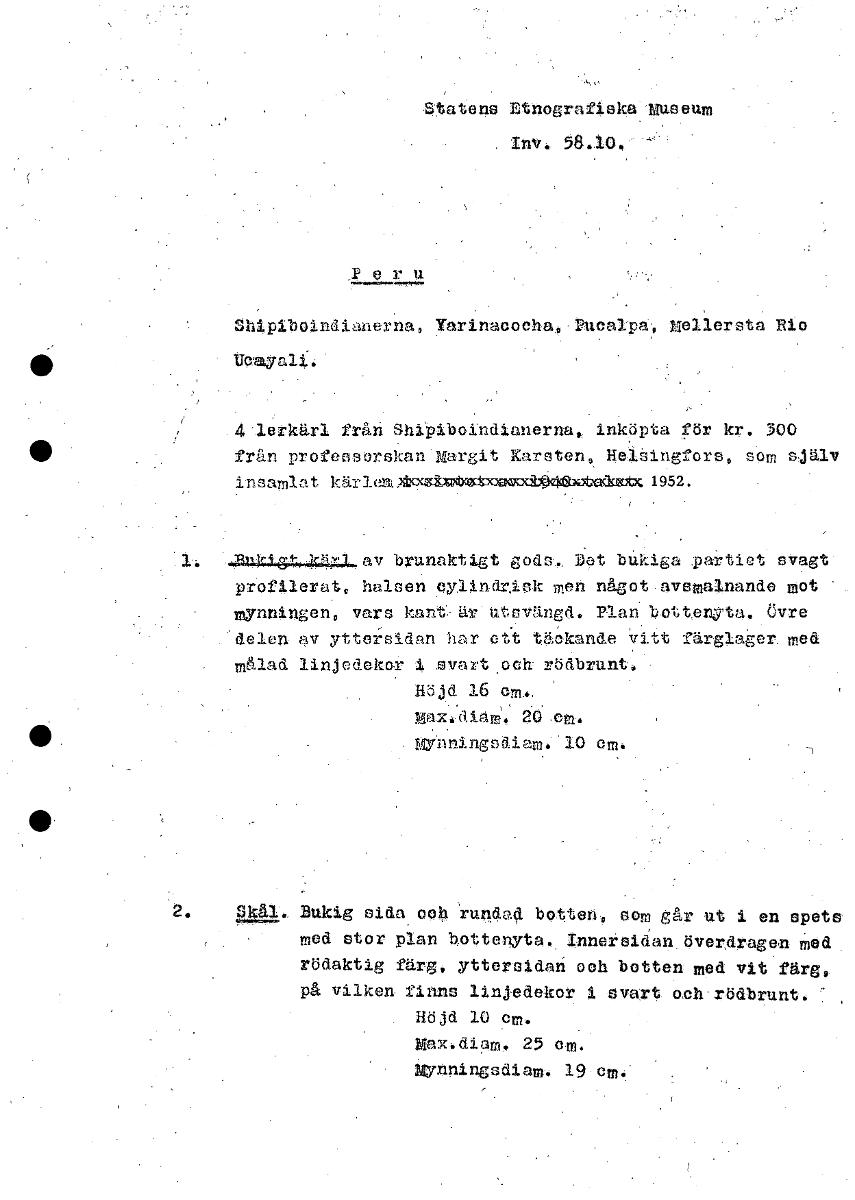 S atens Etnografiska museum trav. 58.10 Shiplboindian rna, Yarinacoeha, Pnealpa, Mellersta Elo Ucayali. 4 lerkärl från ShiPiboindianerna, inköpta för kr. 300 från professorskan Margit Karsten, He:singfors, som själv insamlat kärlen 1952. 43.141:444..a_av brunakt ;t gods.. ljet bukiga partiet svagt profilerat, halsen cylindrisk men något avsmalnande mot mYnningen, vars kant är utsvän d. Plan* bottenyta. Övre delen av ytte=rsidan har ett täckande V .tt färgIager med målad linjedekor i svart och rödbrunt. Höjd 16 cm., max.dia6. 20 ml. gynningsdiam. 10 cm. 2. Skål. Bukig sida och rundad botten, som går ut i en spets med stor plan bottenyta. Innersidan överdragen med rödaktig färg, yttersidan och botten med vit färg, på vilken finns linjedekor 1 svart och rödbrunt. Höjd 10 cm. max.diam. 25 cm. Mynningsdiam. 19 em. [ocr]