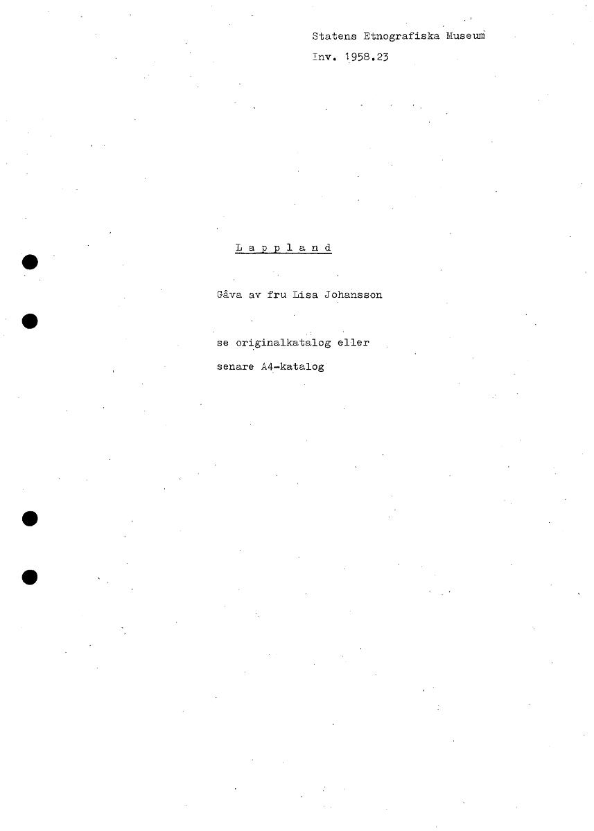 • Statens Etnografiska Museuni Inv. 1958.23 Lappland Gåva av fru Lisa Johansson se originalkatalog eller senare A4-katalog • • [ocr]