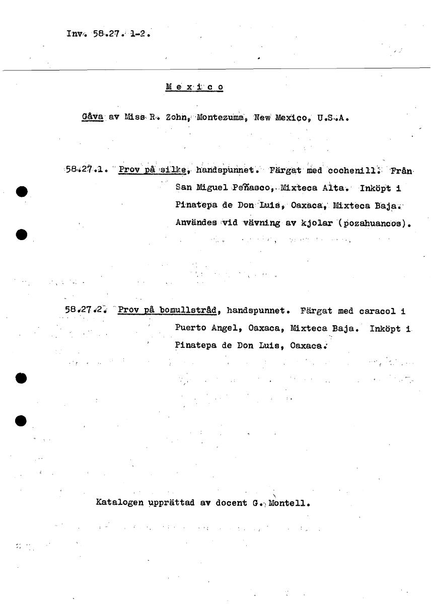 • In',. 58.27 Mexico Gåva av Miss- R. Zohn„ 'Montezuma', New Mexico, U.S.A. 58427.1. ' Prov på silke, handsPUnnet. Färgat med cochenill:, Trån. San Miguel Pdäasco,-Mixteca Alta, Inköpt i Pinatepa de Don... Visa hela