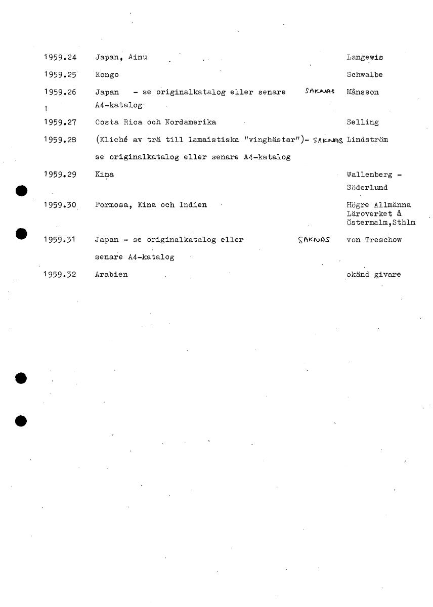 1959.24 Japan, Ainu Langewis 1959.25 Kongo Schwalbe 1959.26 Japan - se originalkatalog eller senare S6r-runt Månsson A4-katalog 1959.27 Costa Rica och Nordamerika Selling 1959.28 (Kliché av trä till lamaistiska "vinghästar")- SAK_Ntgg Lindström se originalkatalog eller senare A4-katalog 1959.29 Kina Wallenberg - Söderlund 1959.30 Formosa, Kina och Indien Högre Allmänna Läroverket å Östermalm,SthIm • 1959.31 Japan - se originalkatalog eller V2tKrvoS von Treschow senare A4-katalog 1959.32 Arabien okänd givare [ocr]Stäng