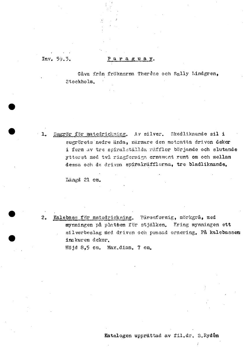 • Inv. 59.3. Gåva frän fröknarna Therke och Sally Lindgren, 2tockholm. • • 10 Iwrör för matedrickping,. Av Alver. Skedliknande sil i sugrörets 'nedre anda, närmare den motsatta driven dekor i form av tr... Visa hela