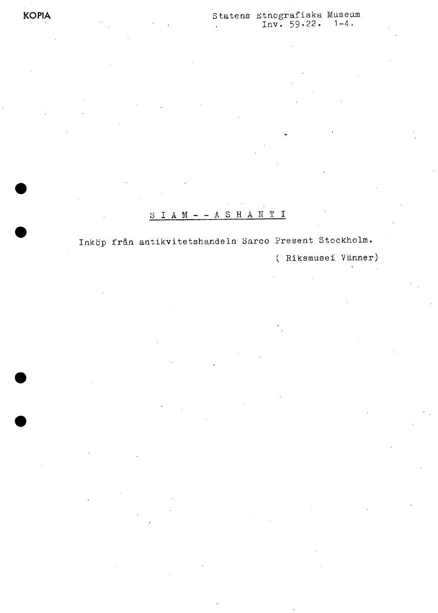 • KOPIA Statens Etnografiska Museum Inv. 59.22. 1-4. S IAM- -ASHANTI Inköp från antikvitetshandeln Sarco Present Stockholm. ( Riksmusei Vänner) [ocr]